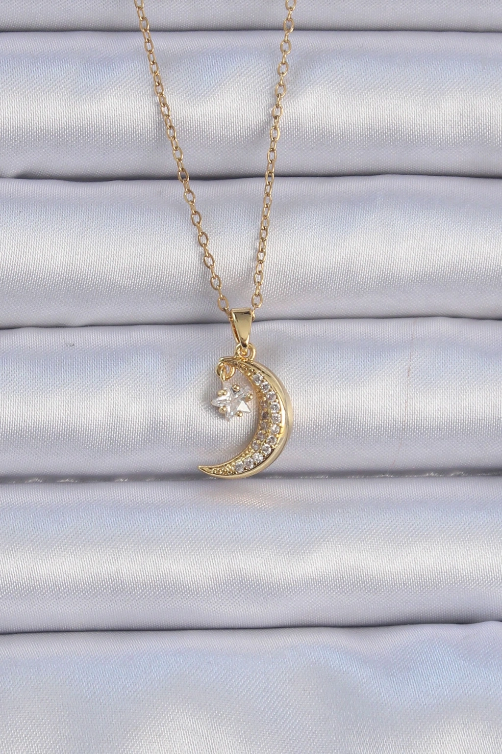 316L Çelik Zincir Altın Renk Zirkon Taşlı Sallantılı Ay Yıldız Kolye