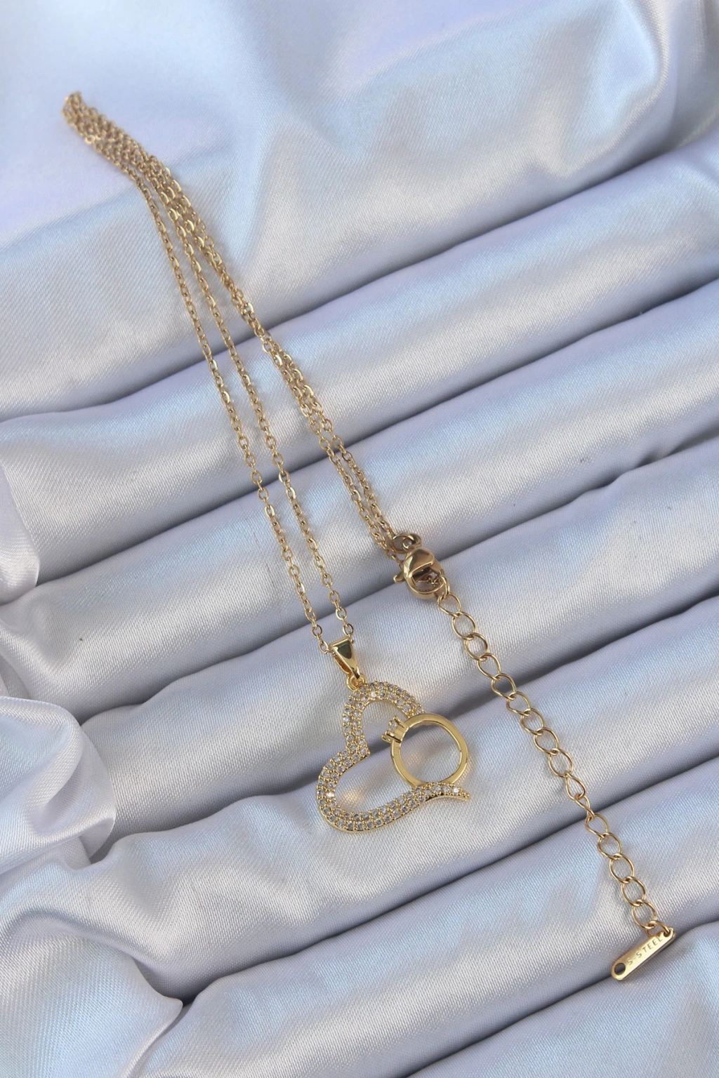 316l Çelik Zincir Altın Renk Zirkon Taşlı Yüzüklü Kalp Kolye
