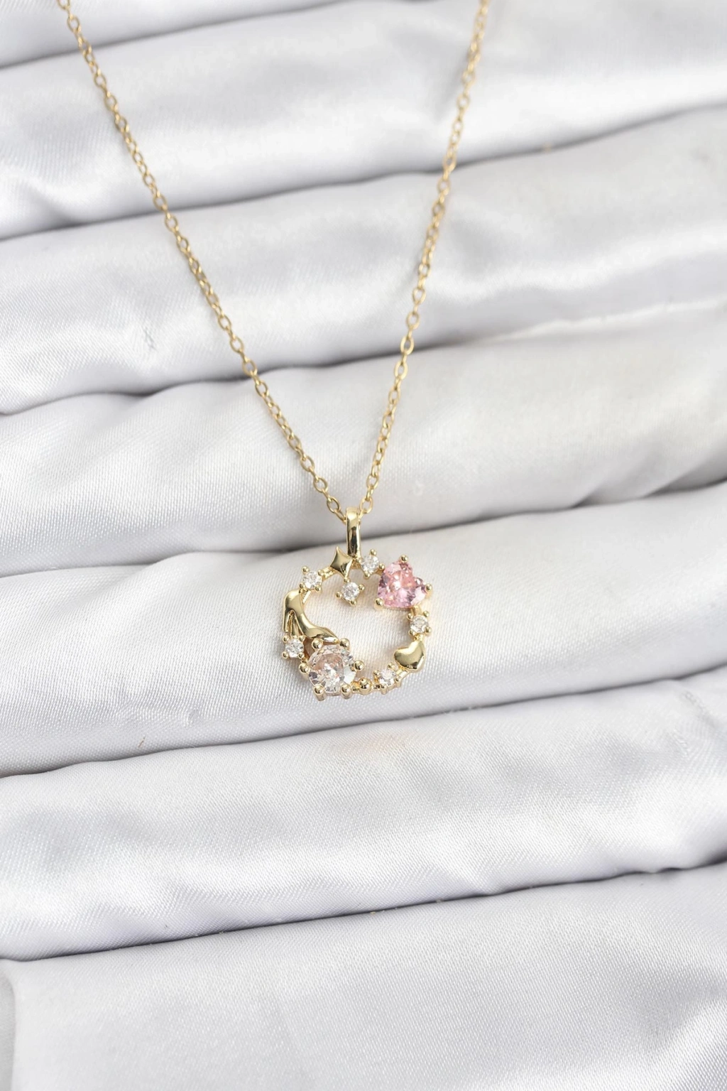 316L Çelik Zincir Gold Renk Pembe Taş Detaylı Çelenk Model Kadın Kolye