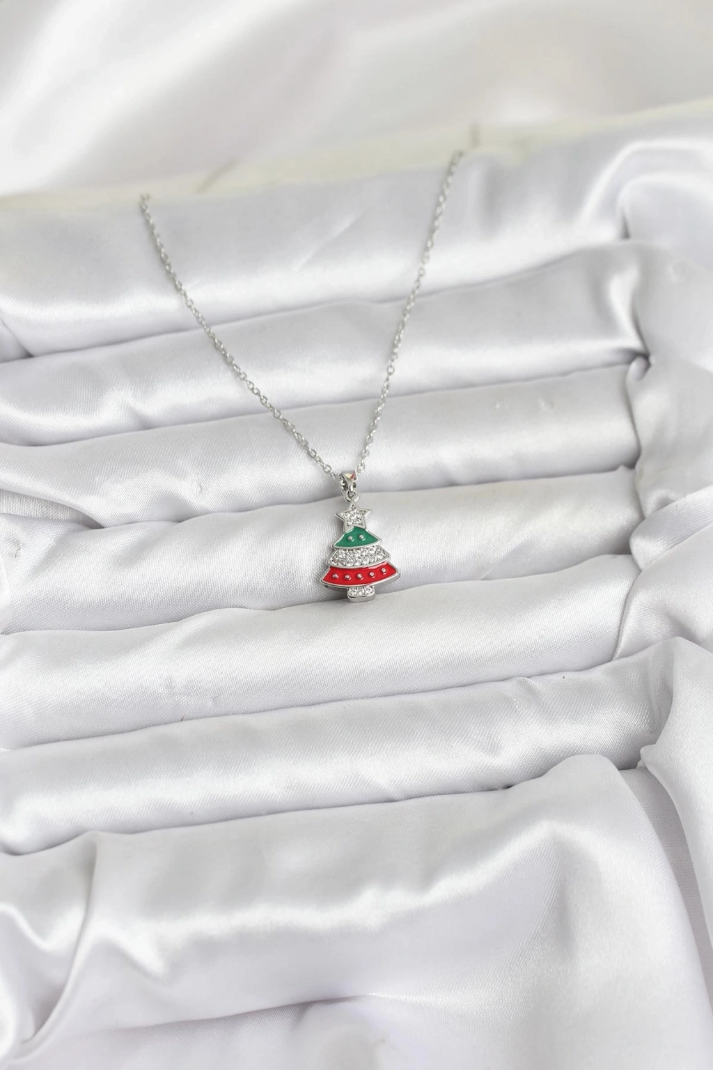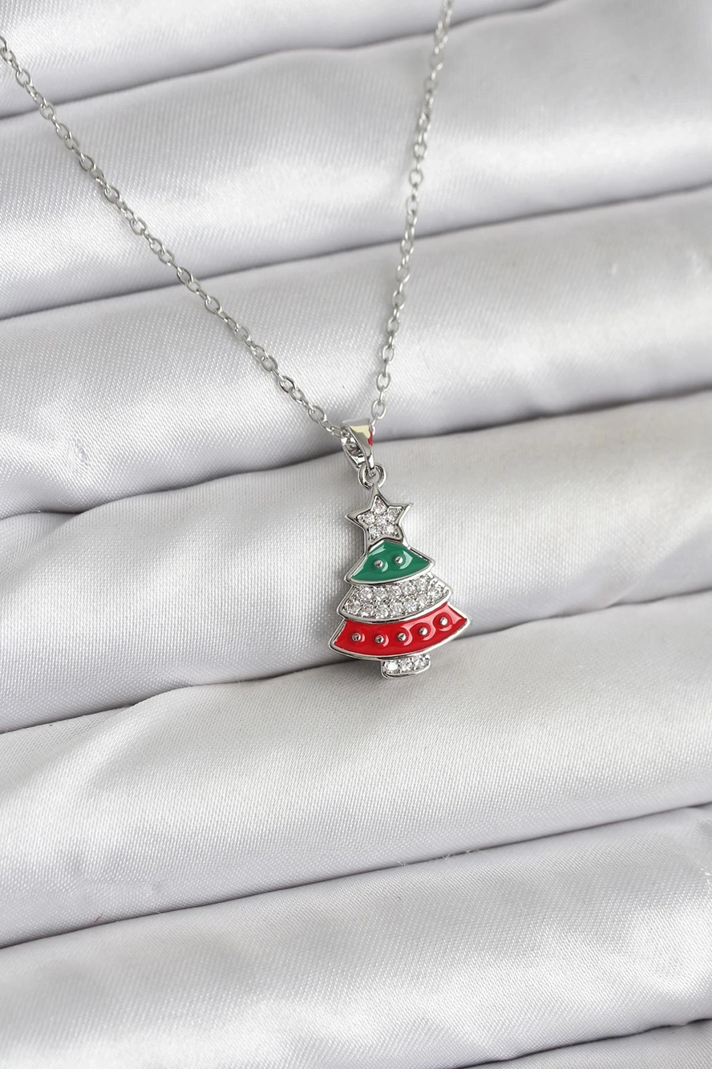 316L Çelik Zincir Gümüş Ren Çam Ağacı Model Zirkon Taşlı Yılbaşı Temalı Kadın Kolye