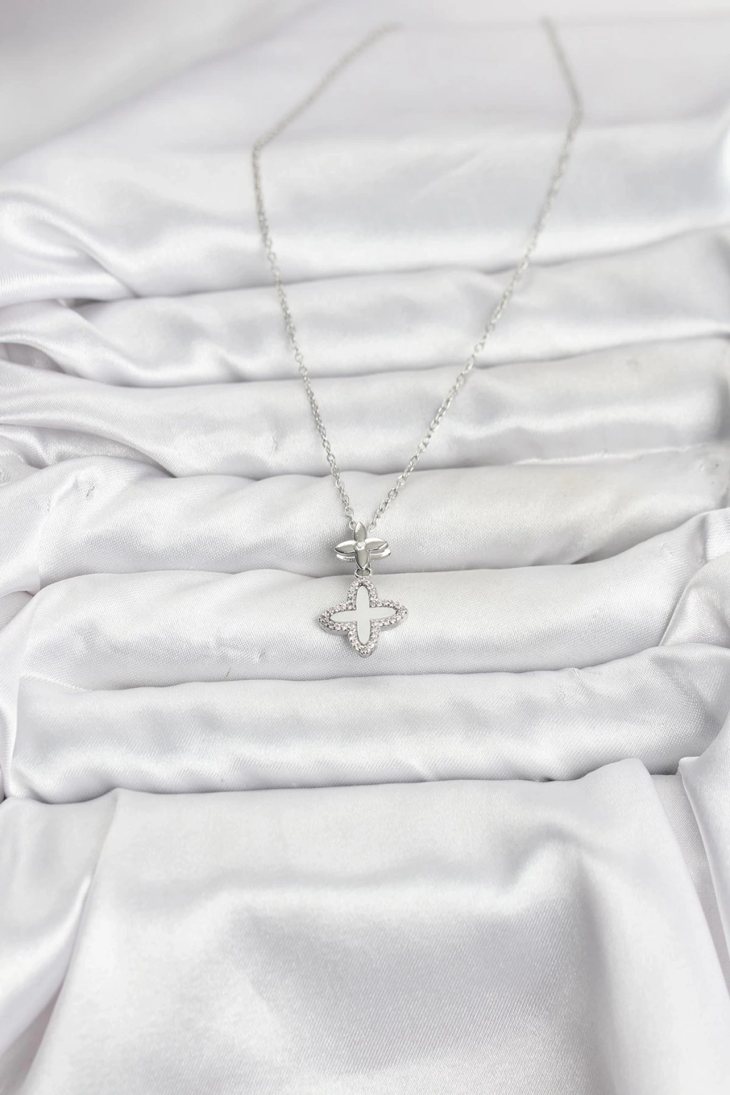 316L Çelik Zincir Gümüş Renk 4 Yapraklı Yonca Model Zirkon Taşlı Kadın Kolye