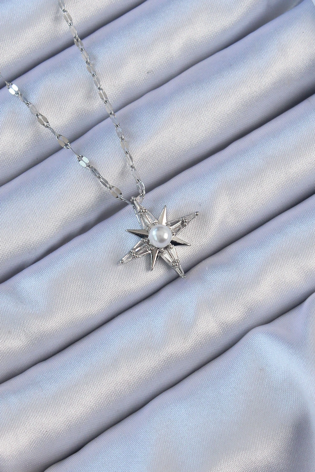 316l Çelik Zincir Gümüş Renk Baget Taşlı İnci Detay Kutup Yıldızı Kolye