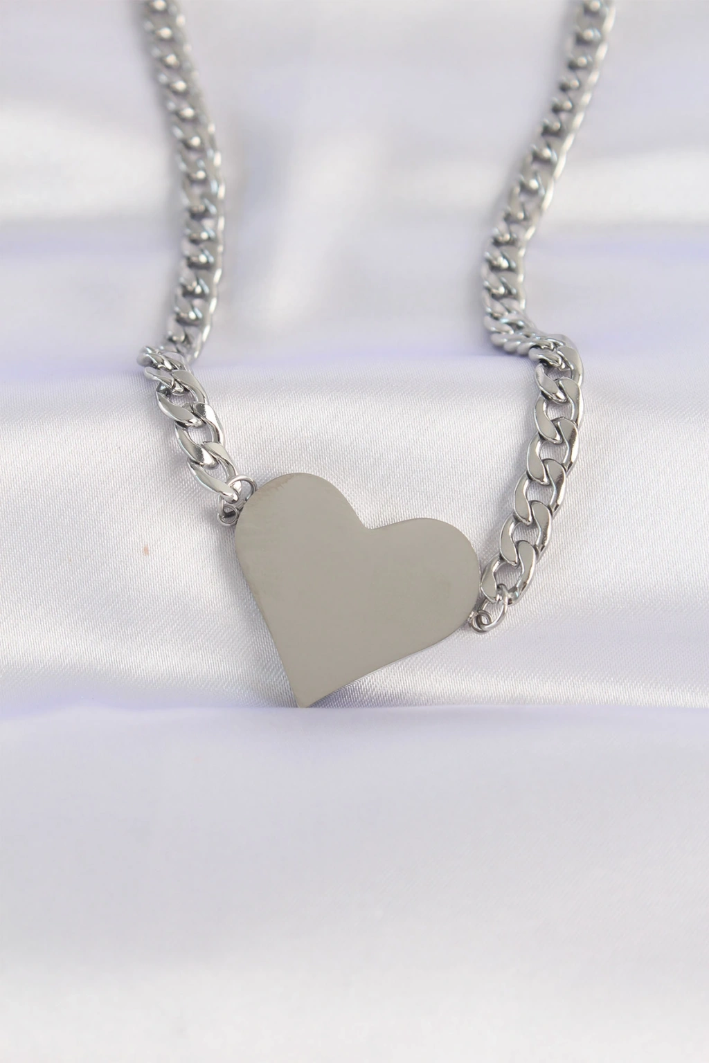 316L Çelik Zincir Gümüş Renk Düz Plaka Kalp Kolye