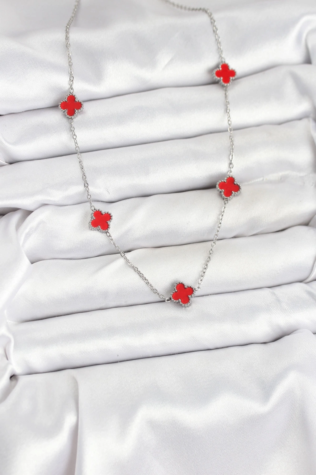316L Çelik Zincir Gümüş Renk Kırmızı Baby Boy Yonca Kadın Kolye