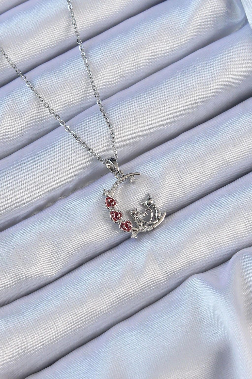 316l Çelik Zincir Gümüş Renk Kırmızı Gül Detay Kedi Figür Zirkon Taşlı Ay Kolye