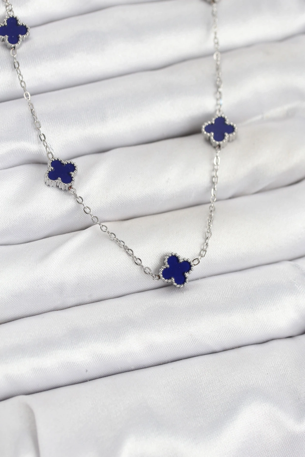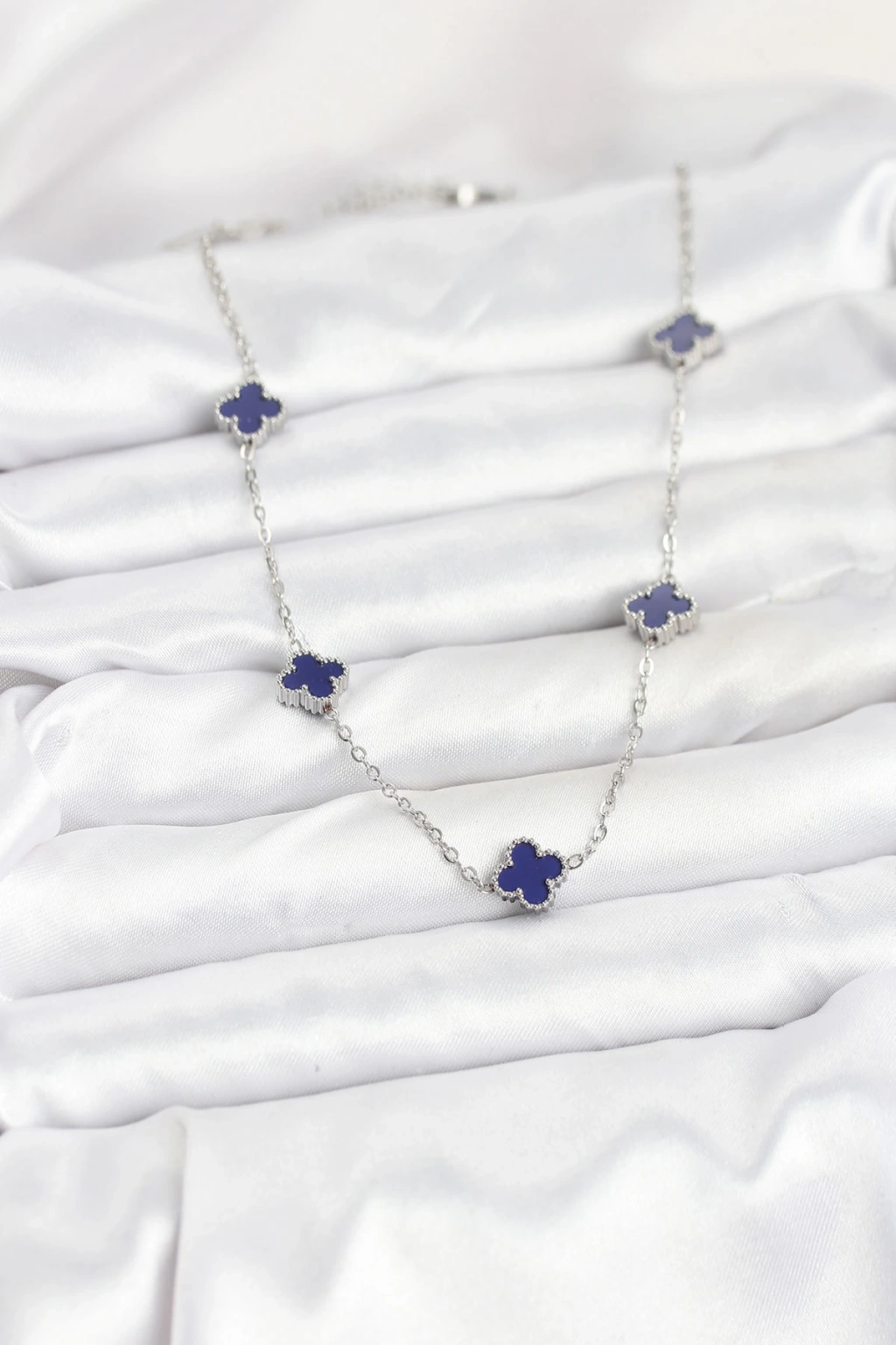 316L Çelik Zincir Gümüş Renk Lacivert Baby Boy Yonca Kadın Kolye