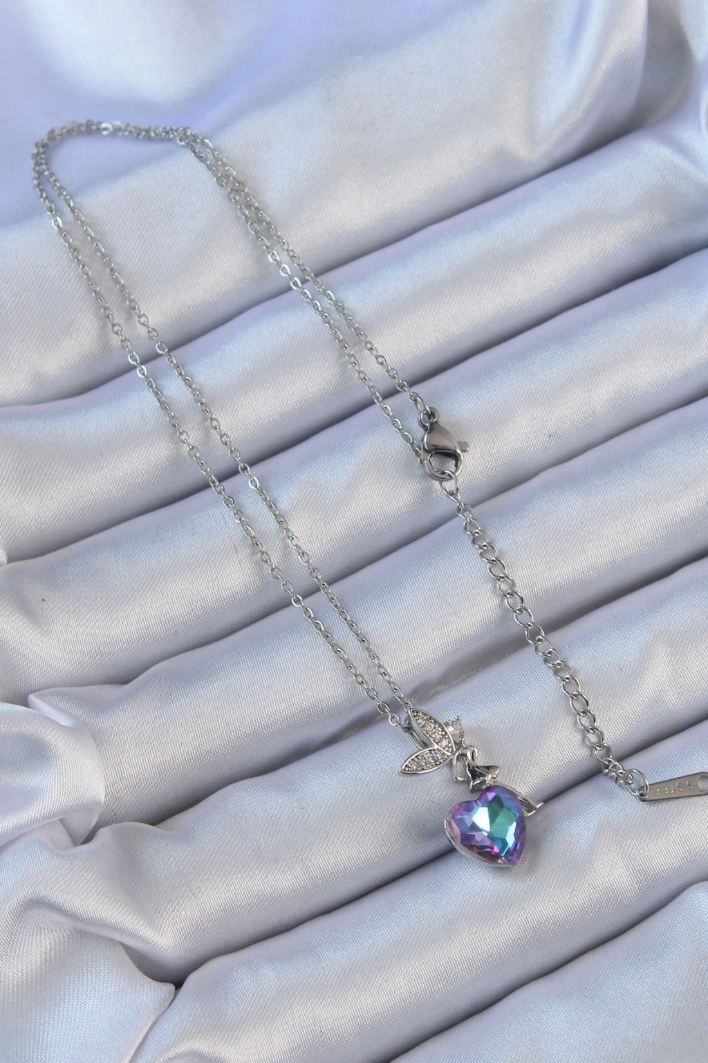 316l Çelik Zincir Gümüş Renk Mor Mavi Renk Zirkon Taşlı Kalp Detay Peri Kolye
