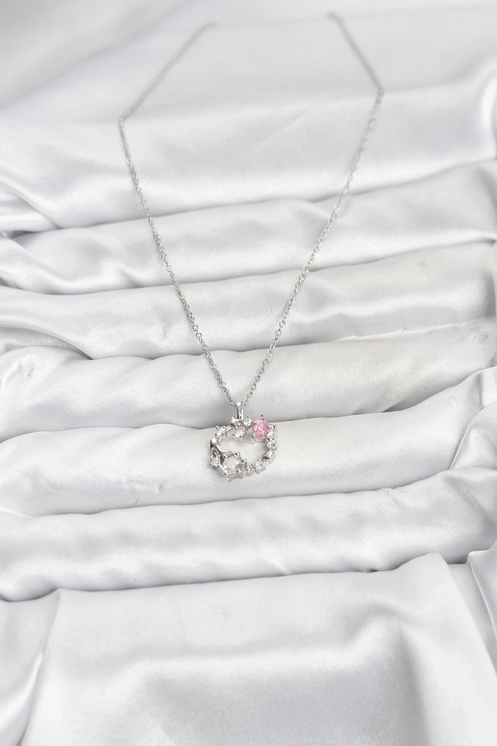 316L Çelik Zincir Gümüş Renk Pembe Taş Detaylı Çelenk Model Kadın Kolye