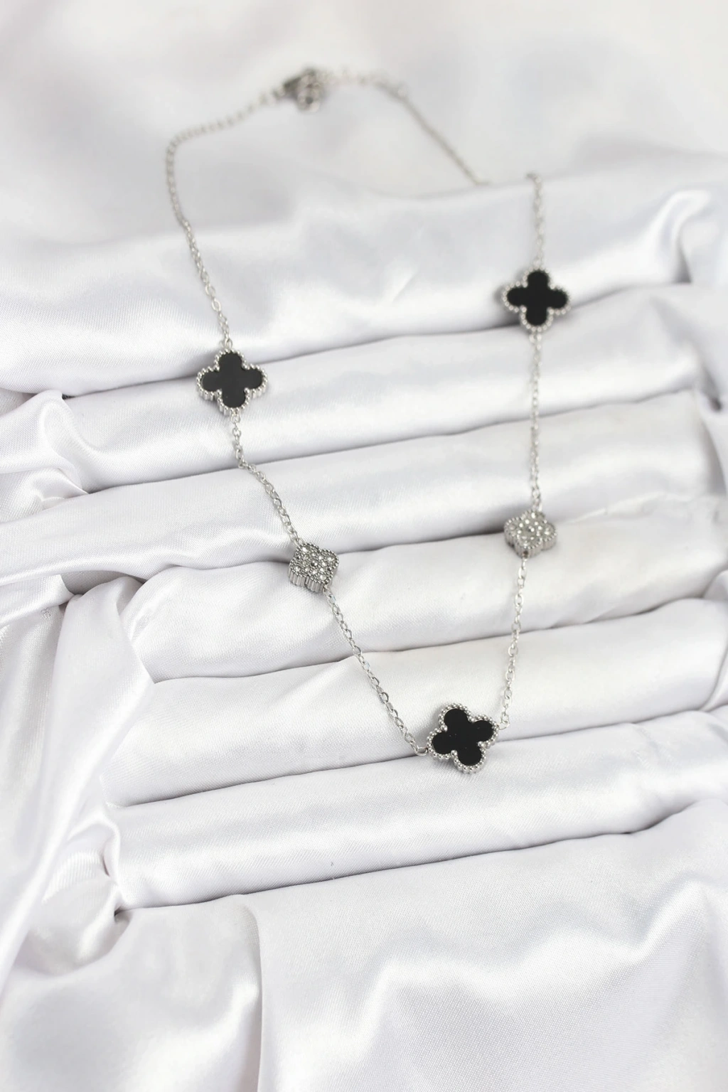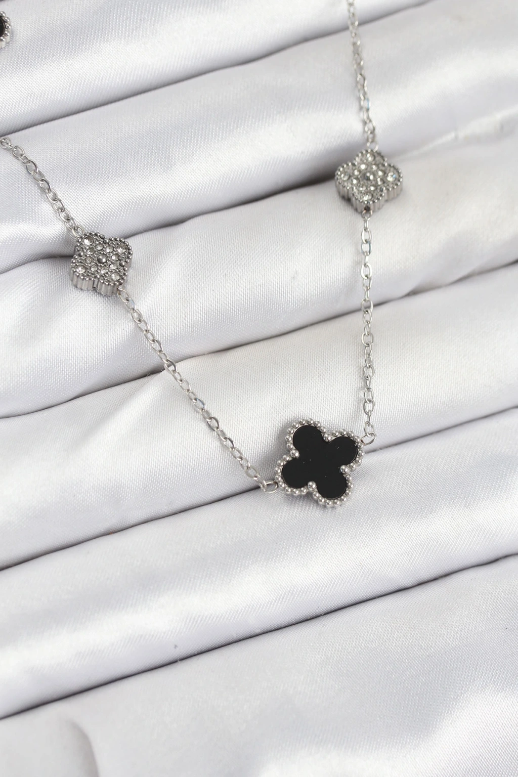 316l Çelik Zincir Gümüş Renk Siyah Ve Zirkon Taşlı Yonca Kadın Kolye