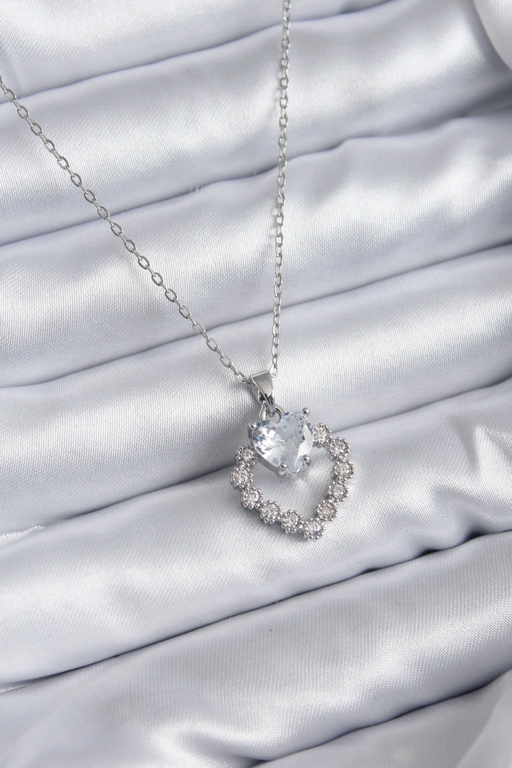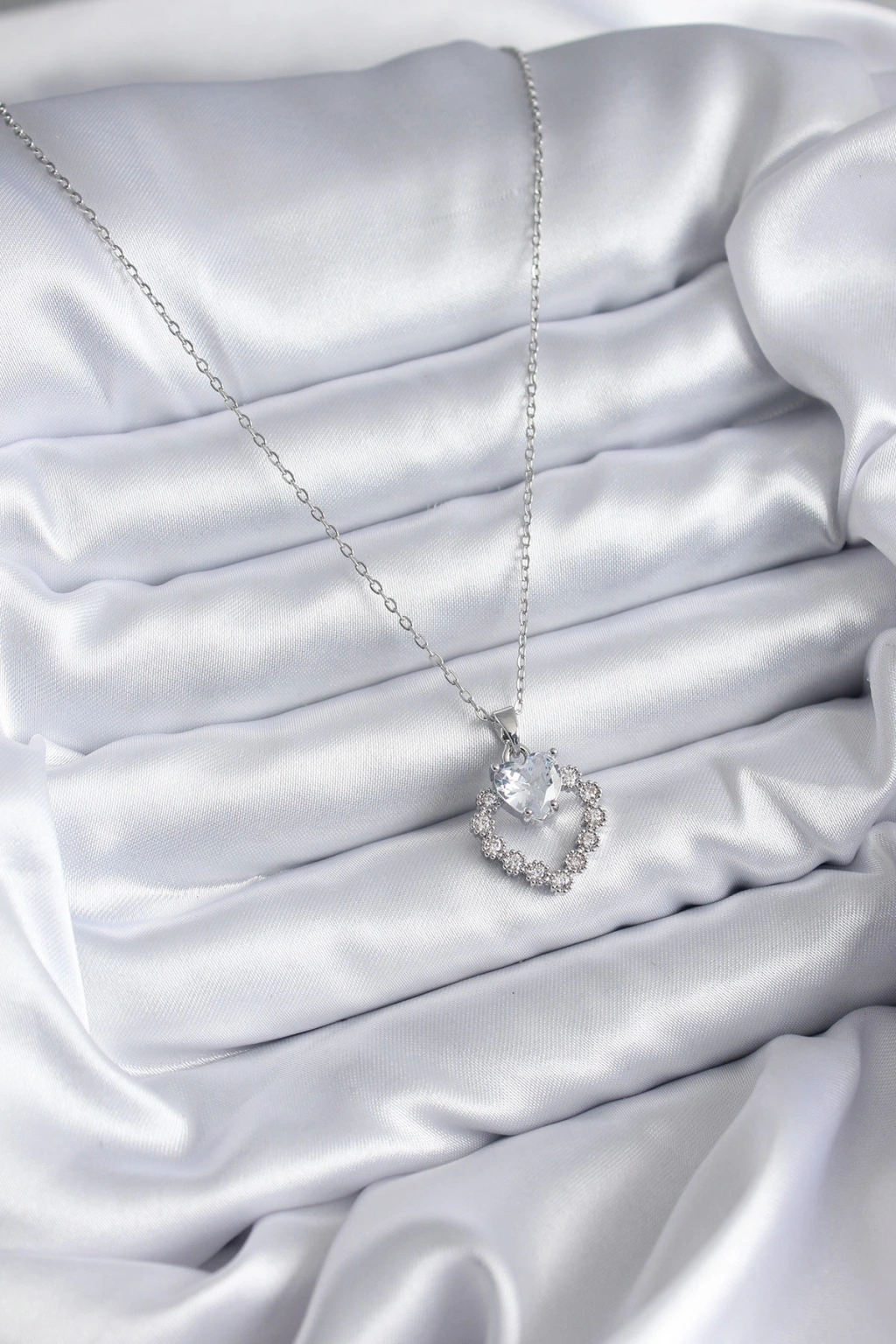 316L Çelik Zincir Gümüş Renk Zirkon Taşlı Kalp Model Kadın Kolye