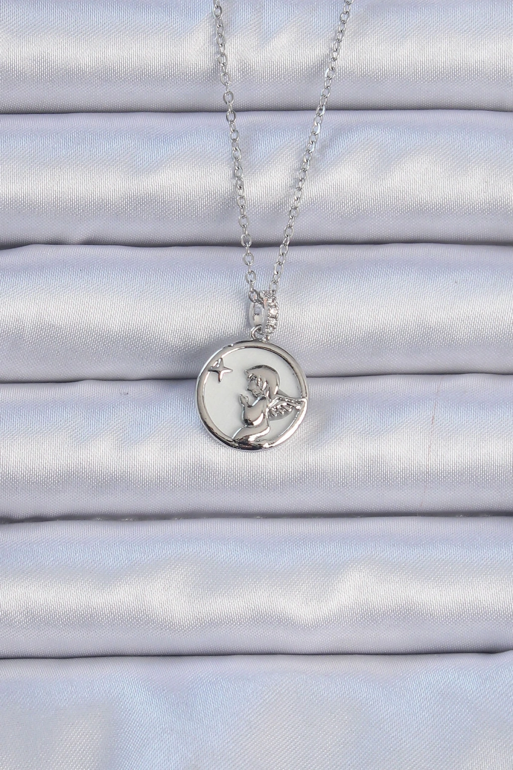 316L Çelik Zincir Gümüş Renk Zirkon Taşlı Mineli Melek Kolye