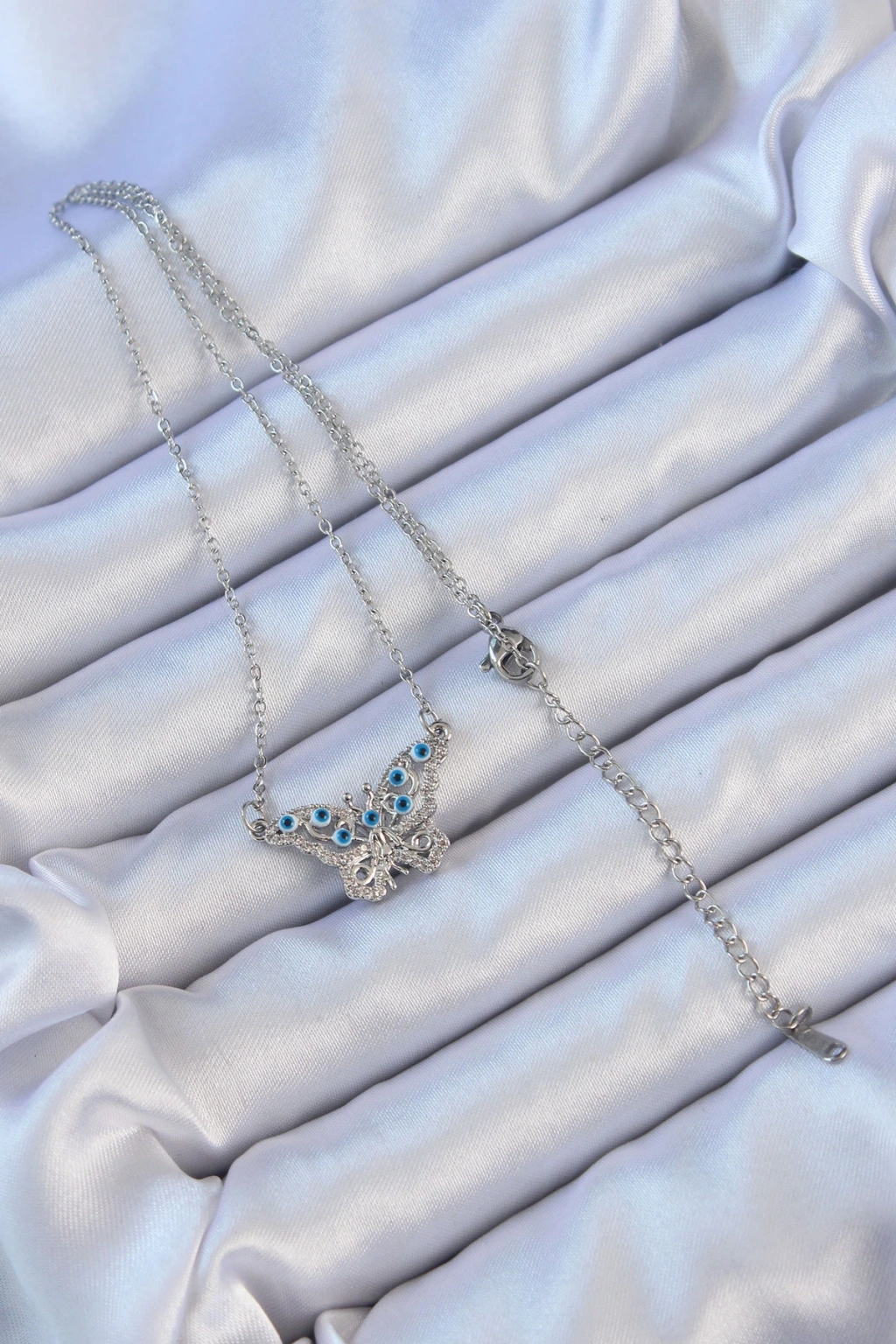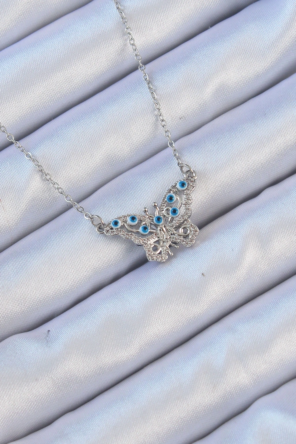 316l Çelik Zincir Gümüş Renk Zirkon Taşlı Nazarlı Kelebek Kolye