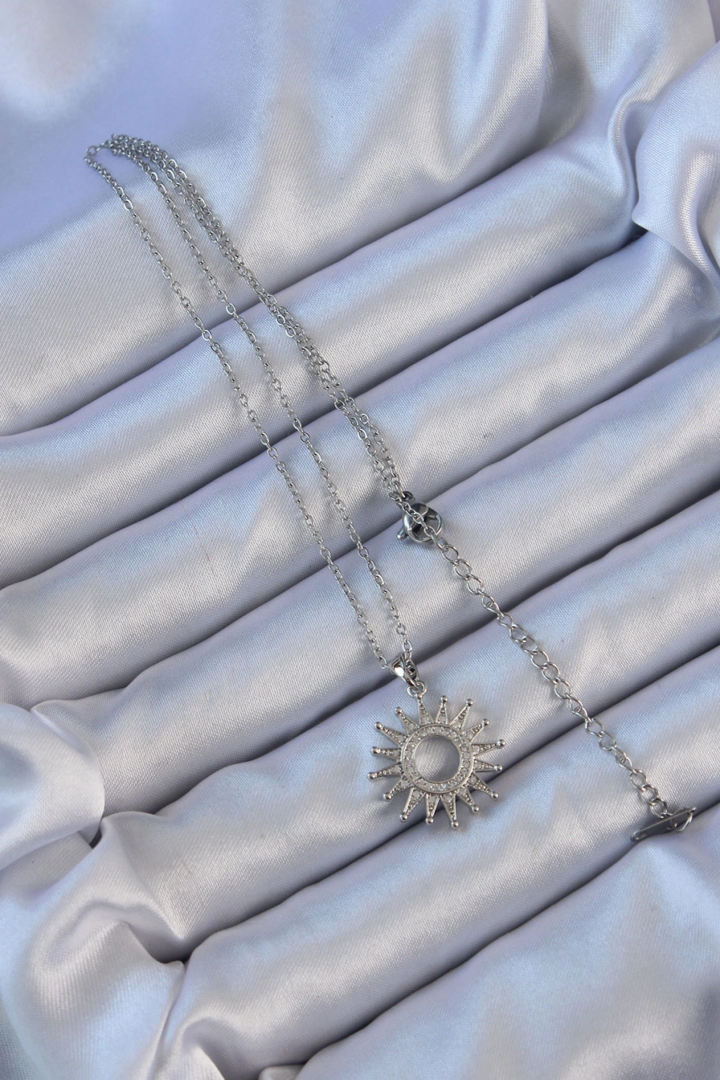 316L Çelik Zincir Gümüş Renk Zirkon Taşlı Parlayan Güneş Kolye