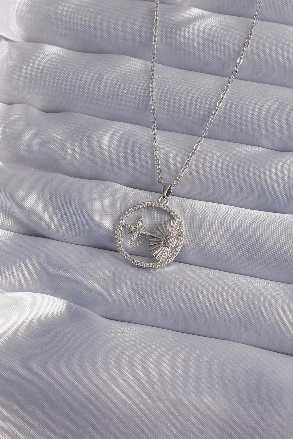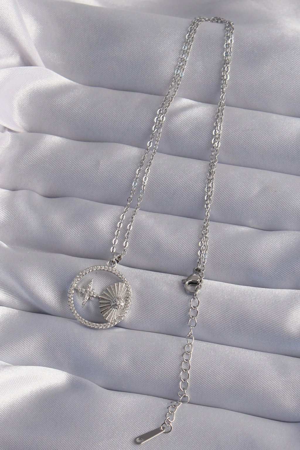 316L Çelik Zirkon Taşlı Yarım Güneş Model Gümüş Renk Kadın Kolye