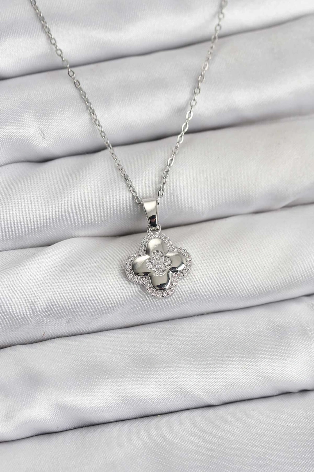 316L Çelik Zincir Gümüş Renk Zirkon Taşlı Yonca Model Kadın Kolye