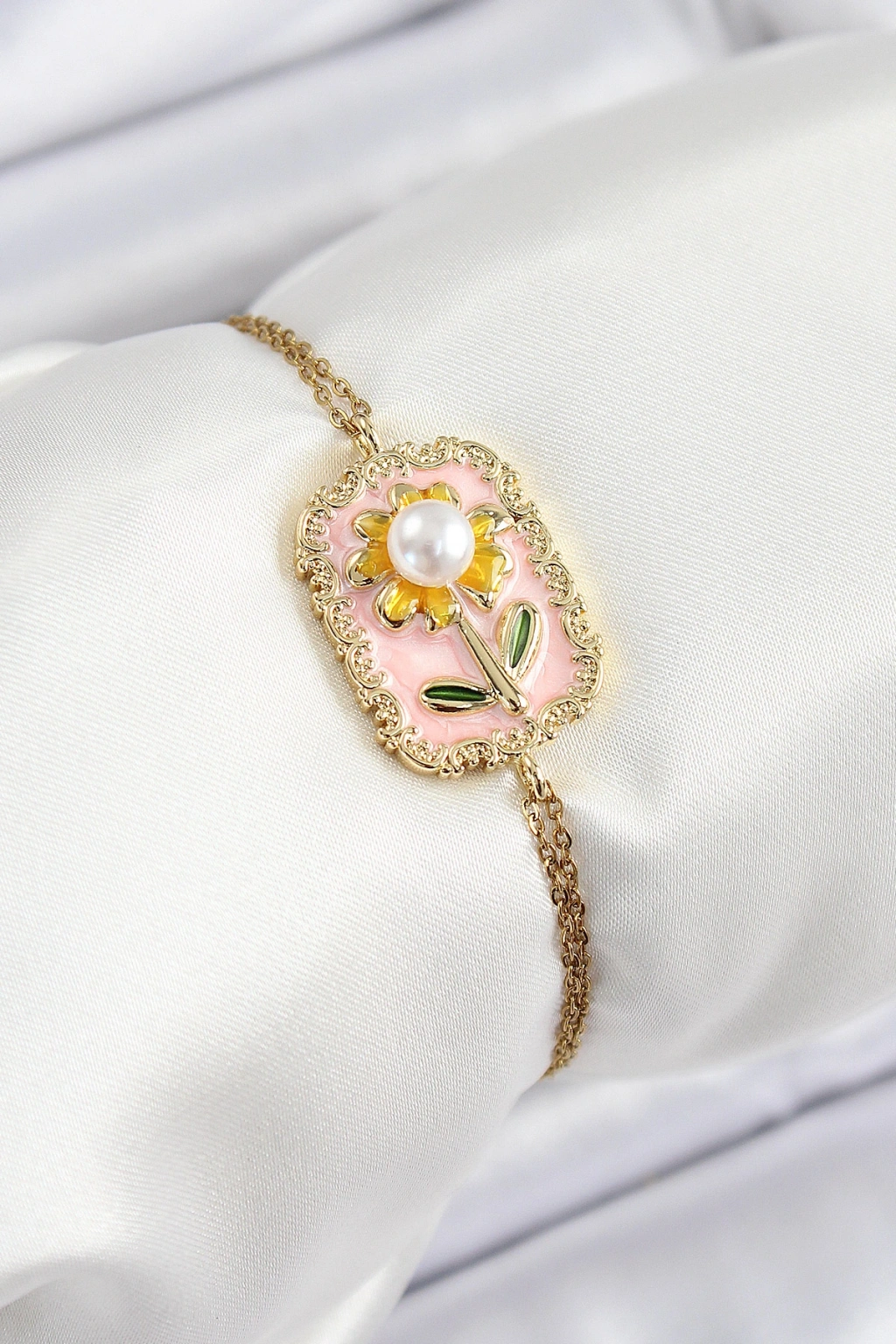 316l Çelik Zincir Pembe Mineli Sanatsal Portre İnci Detaylı Papatya Model Gold Renk Kadın Bileklik