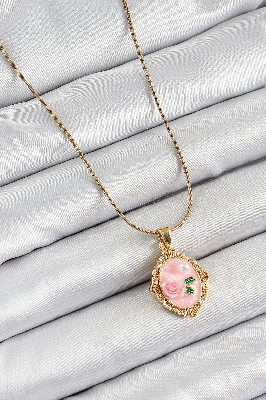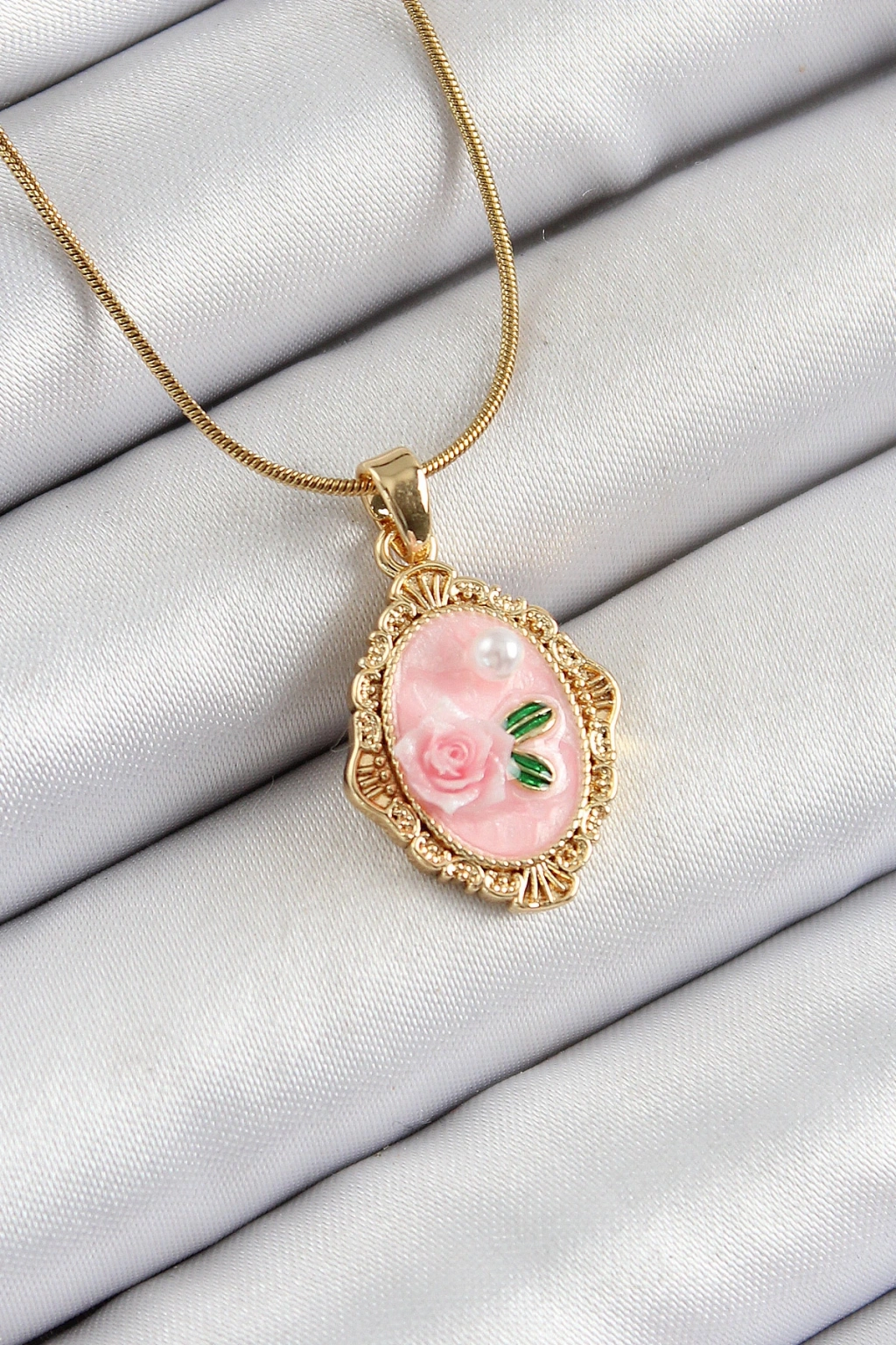 316l Çelik Zincir Pembe Sanatsal Portre İnci Detaylı Gül Figürlü Model Gold Renk Kadın Kolye