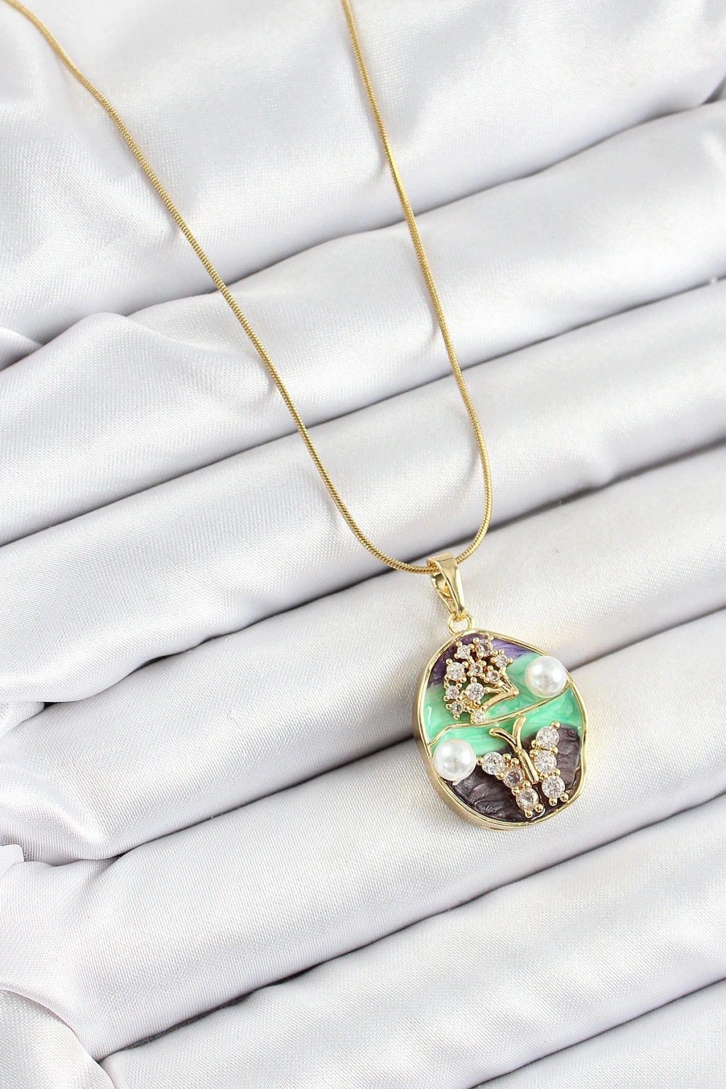 316l Çelik Zincir Zirkon Taşlı Yeşil Mor Sanatsal Portre İnci Detaylı Ağaç Ve Kelebek Figürlü Model Gold Renk Kadın Kolye