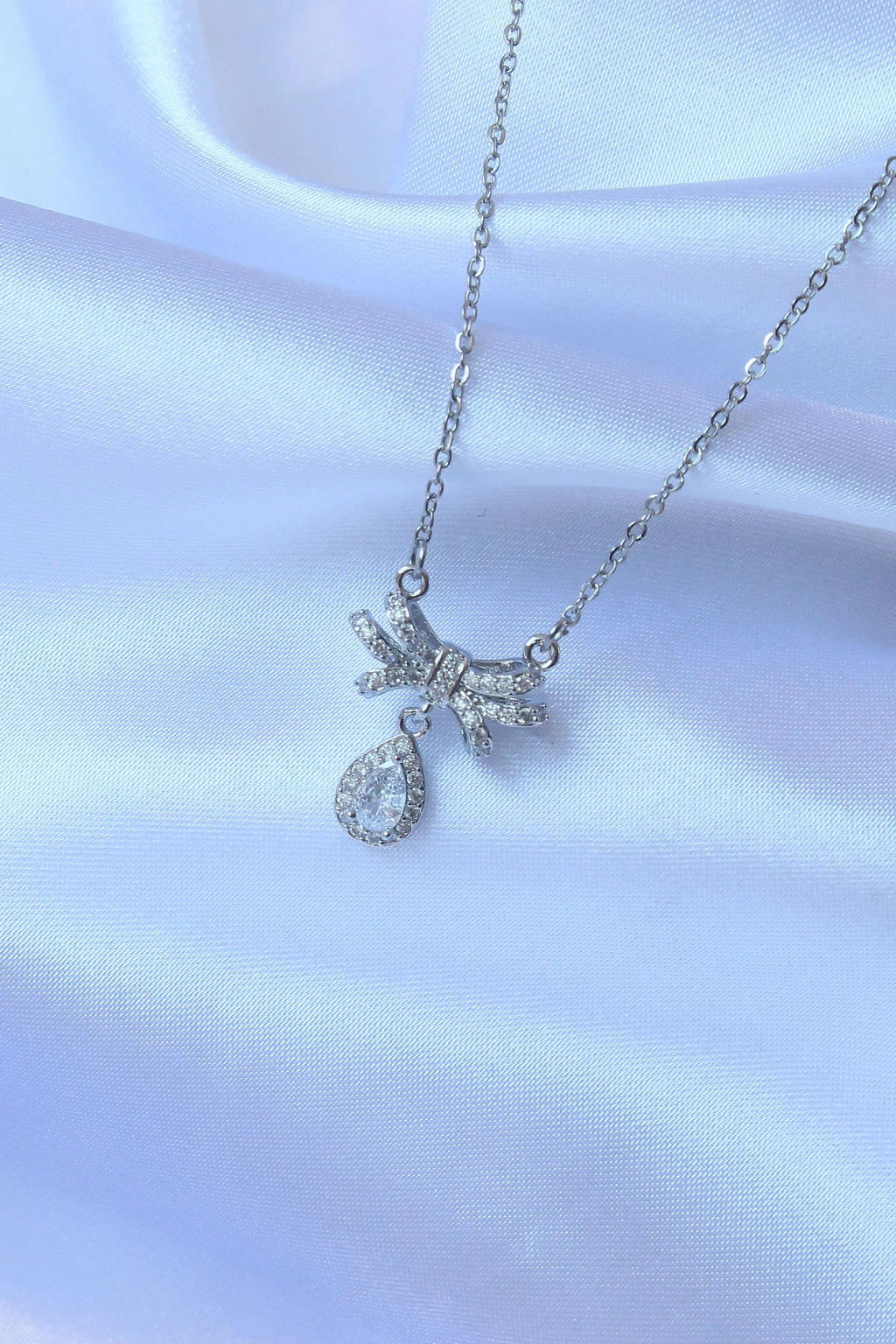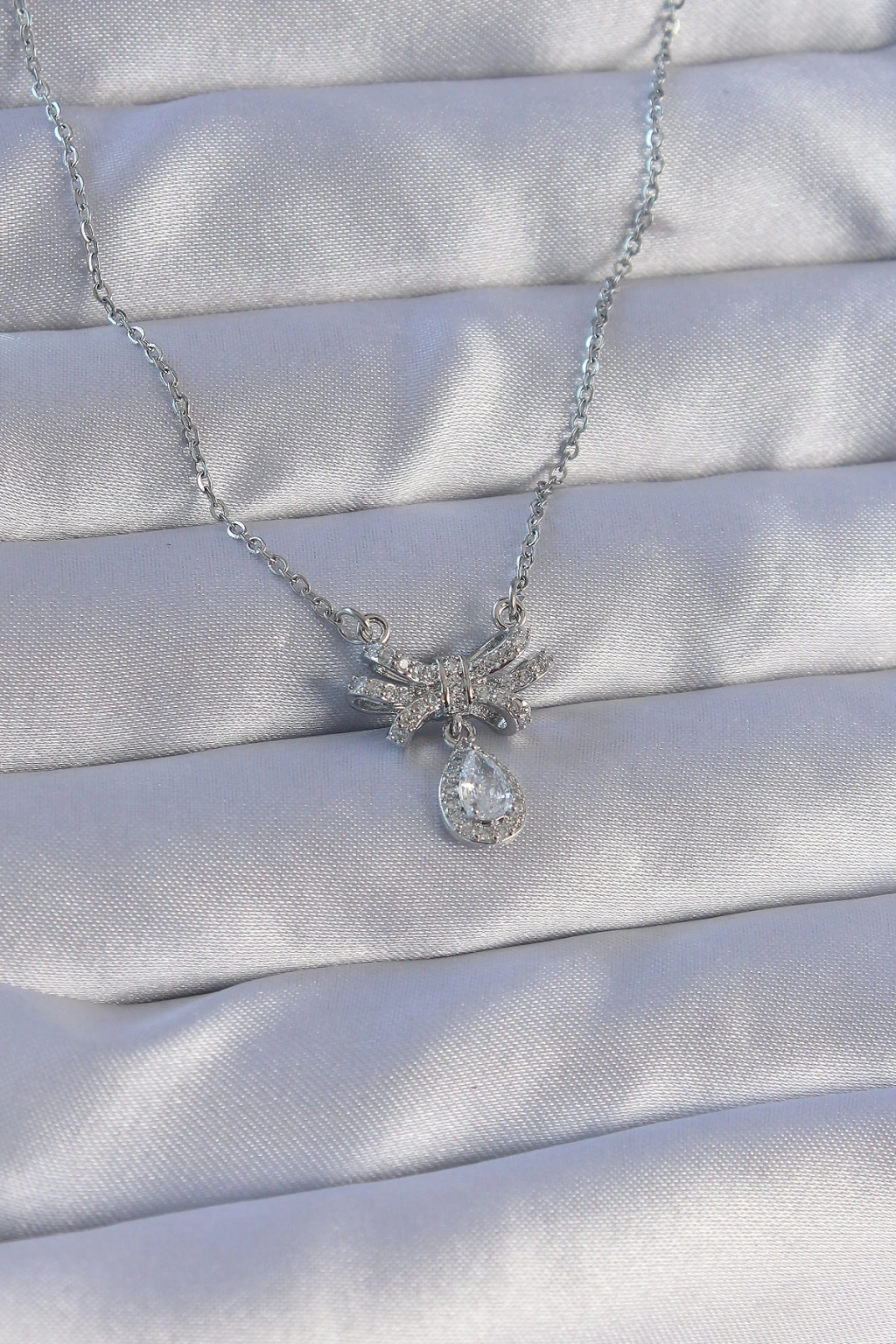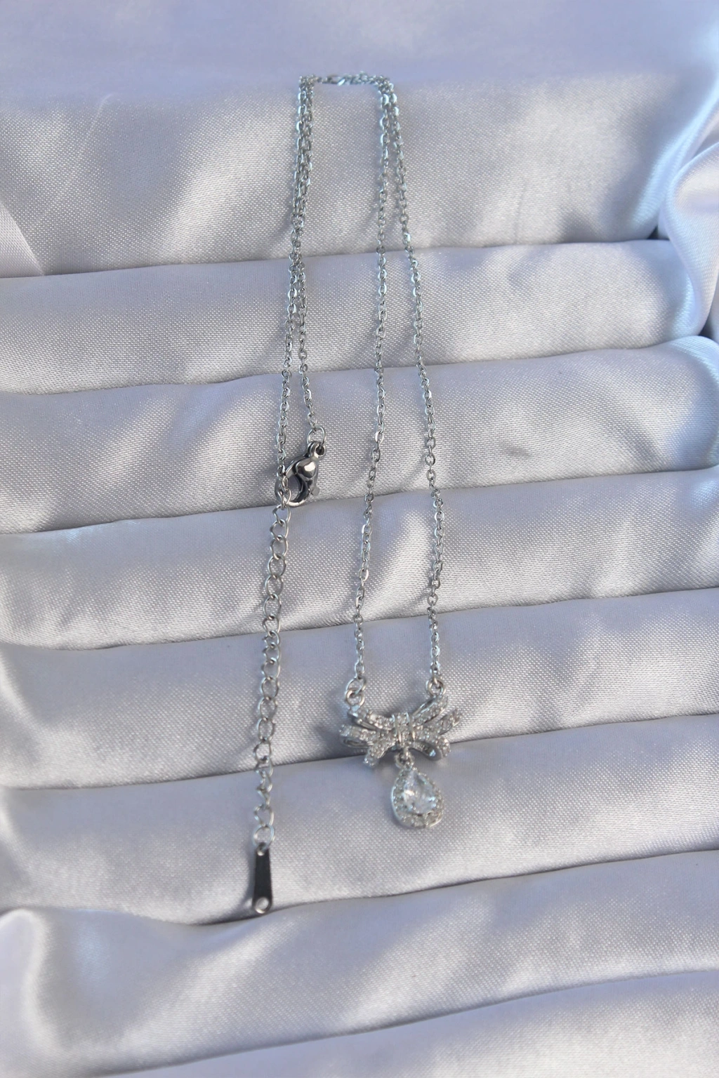 316l Çelik Zincirli Gümüş Renk Zirkon Taşlı Damla Detay Fiyonk Model Kolye