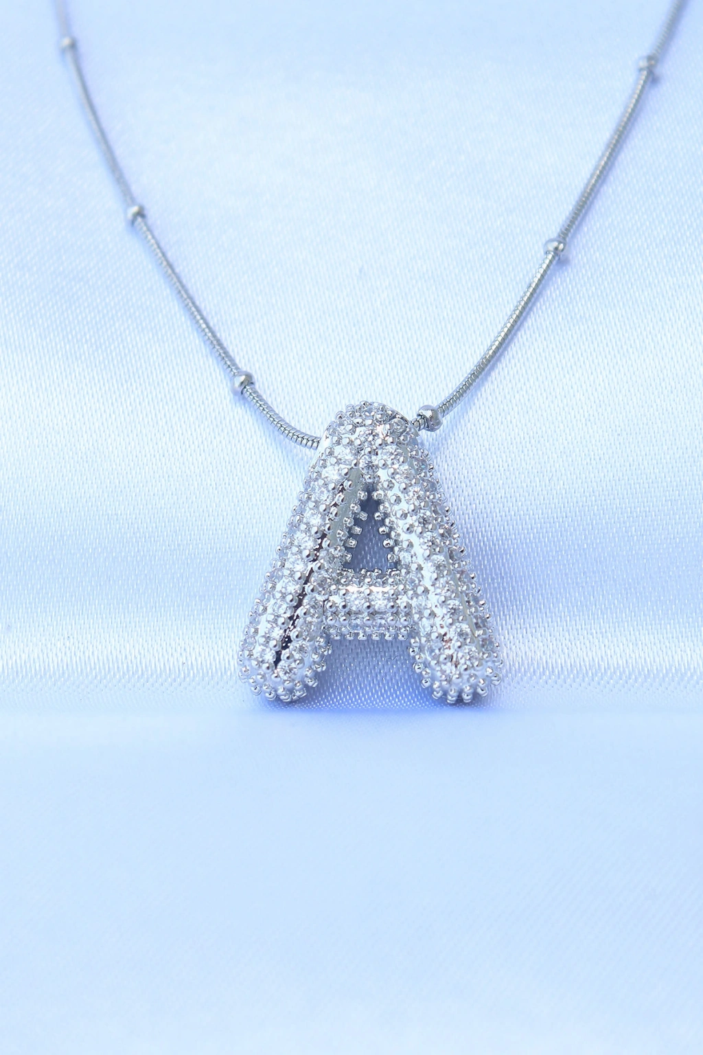 316L Çelik Zincirli Zirkon Taşlı A Harfli Gümüş Renk Bubble Kolye