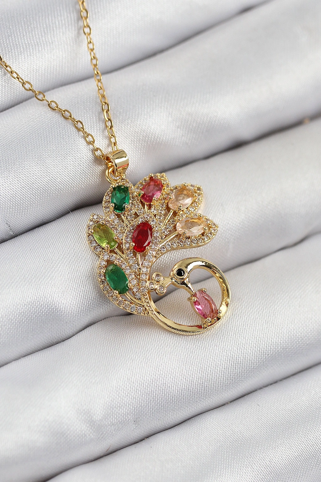 316L Çelik Zirkon Taşlı Tavus Kuşu Model Gold Renk Kadın Kolye