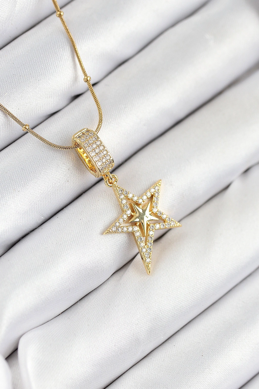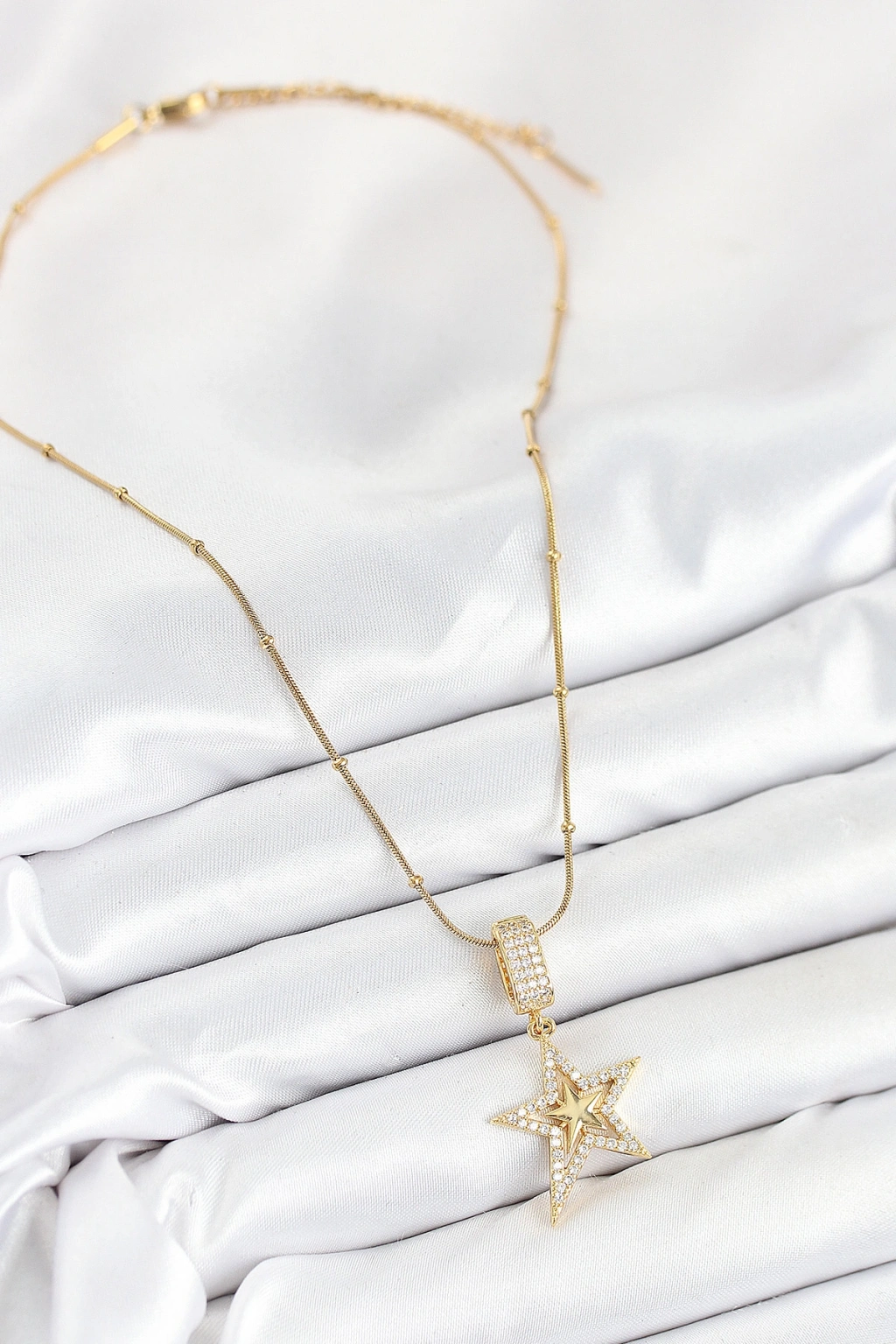 316L Çelik Zincir Gümüş Renk Zirkon Taşlı Tasarım Altın Renk Yıldız Kolye