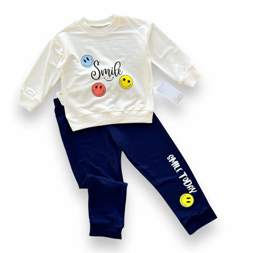 6-9-12-18 Ay Emoje Baskılı Pamuk Penye Kumaş Erkek Bebek Takımı Lacivert