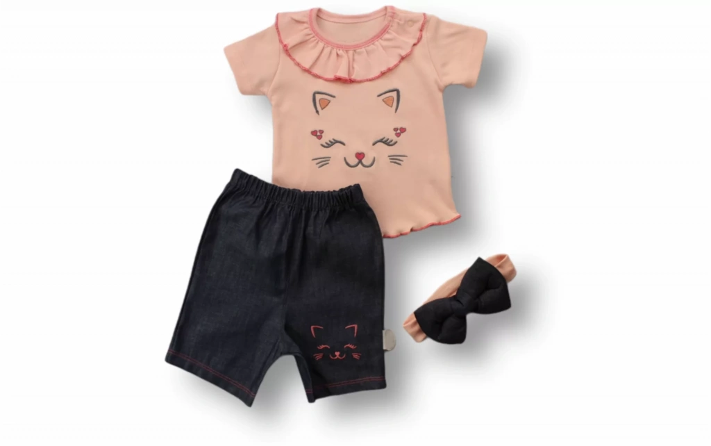 6-9 9-12 12-18 Ay Vip Kedi Baskılı Bandanalı Kısa Kollu Sweat 3lü Kız Bebek Takımı Pudra