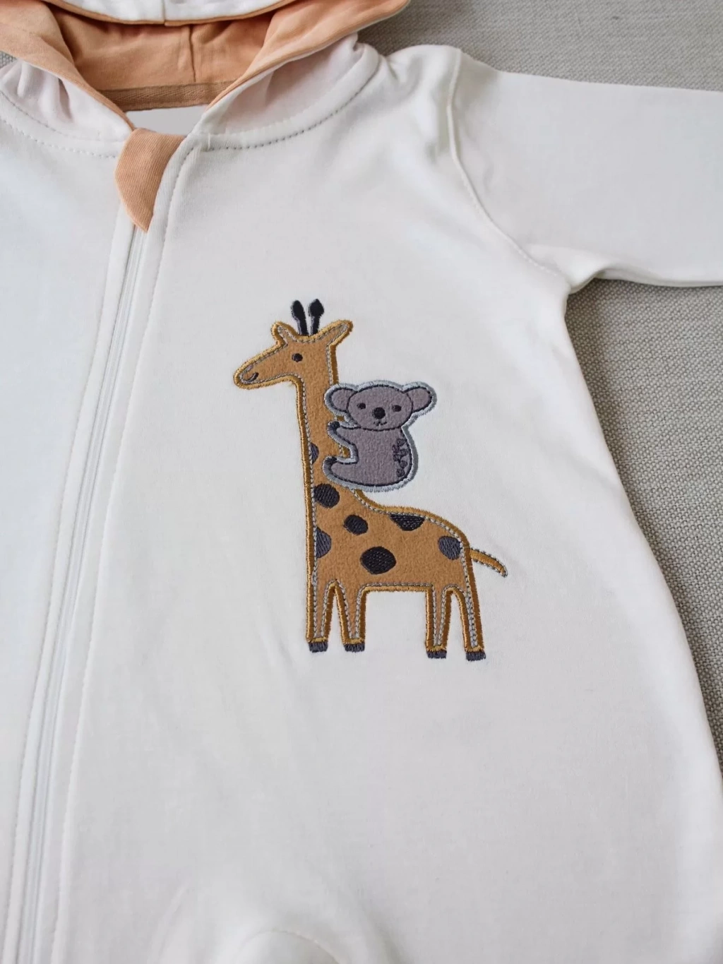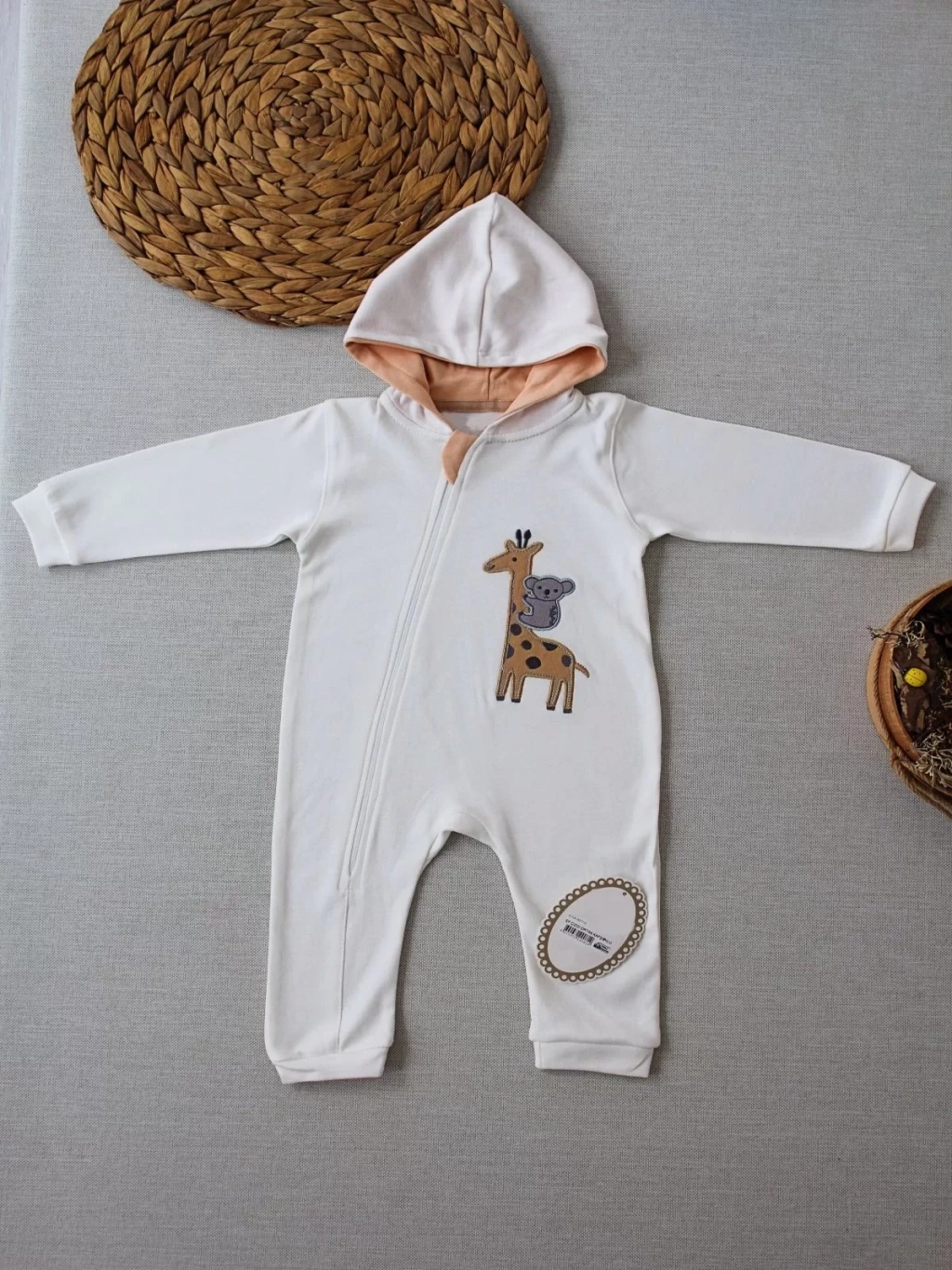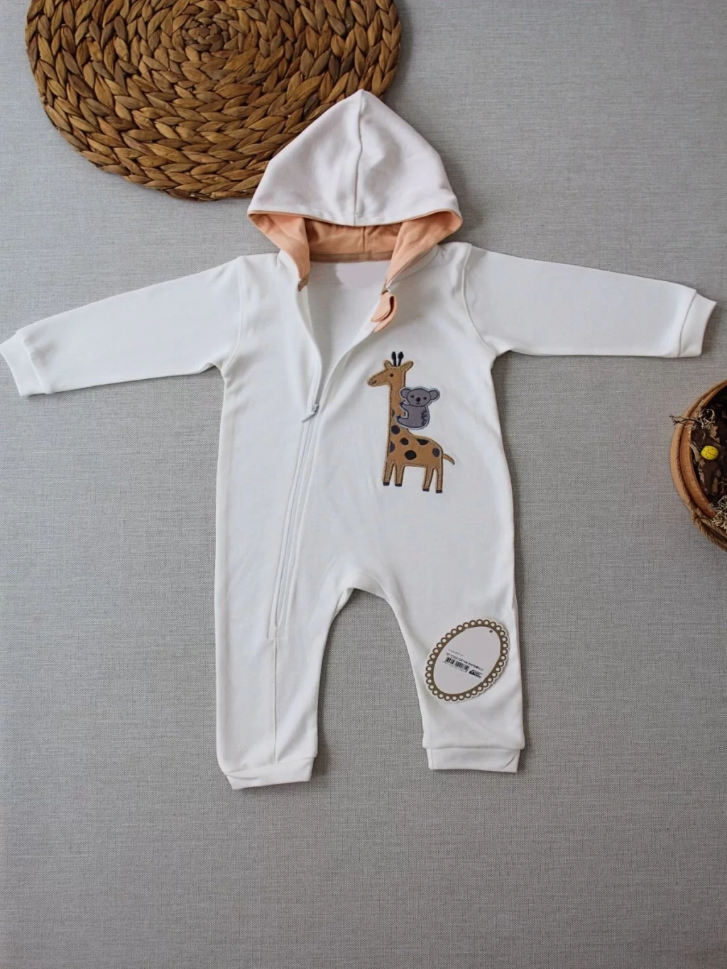 6-9 9-12 Ay Ef Çizgi Boy Fermuarlı Zürafa Nakışlı Kapşonlu Kız Erkek Bebek Tulumu Ekru