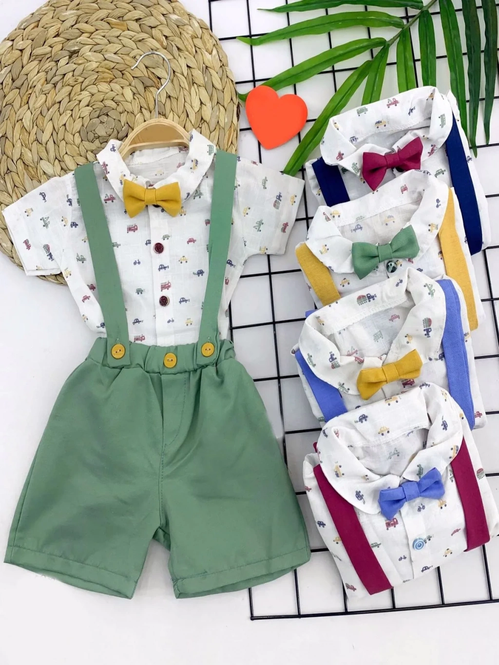 9-12-18-24 Ay Pamuk Keten Cepli Çizgili 2li Erkek Bebek Salopet Takımı Sarı