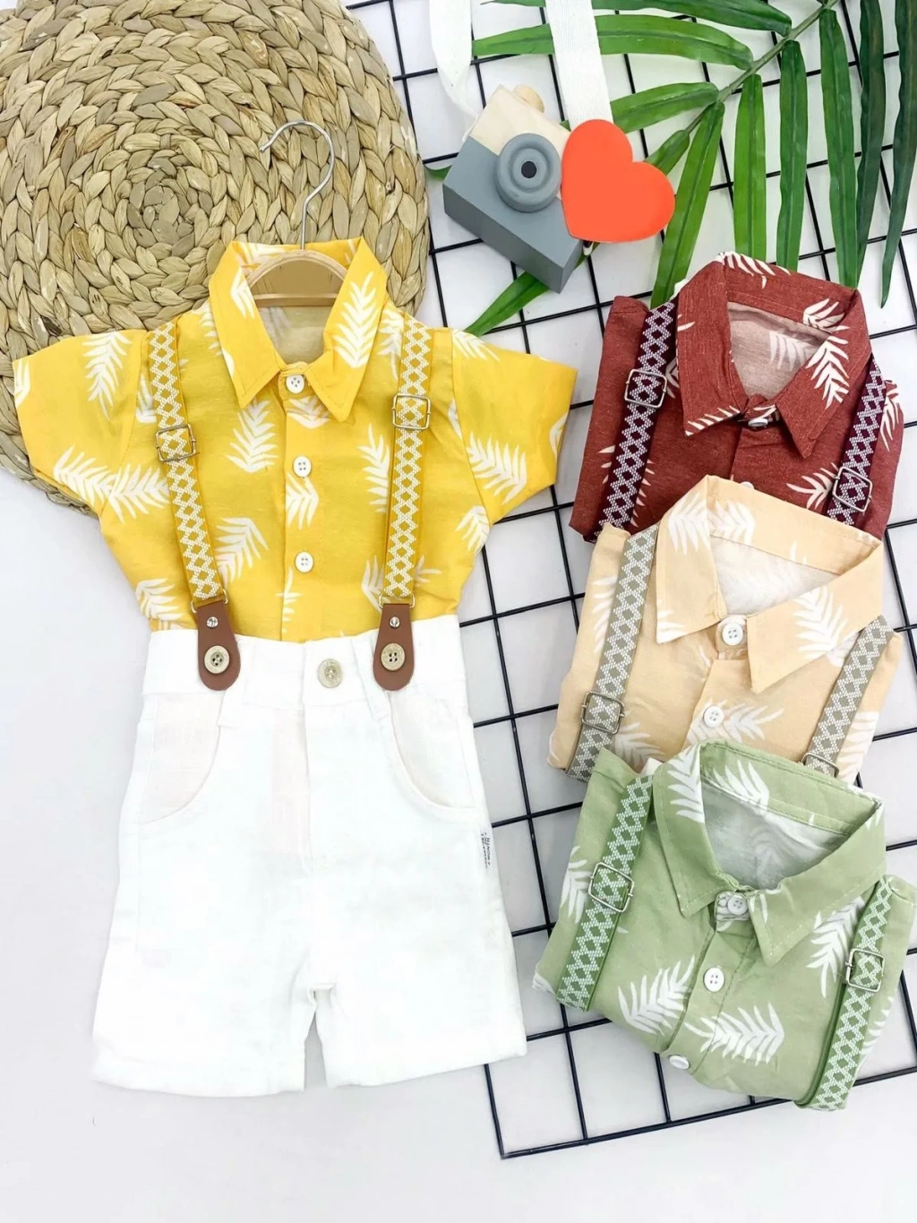 9-12-18-24 Ay Pamuk Keten Kumaş Hawai Gömlek Lastik Askılı 2li Erkek Bebek Takımı Bej