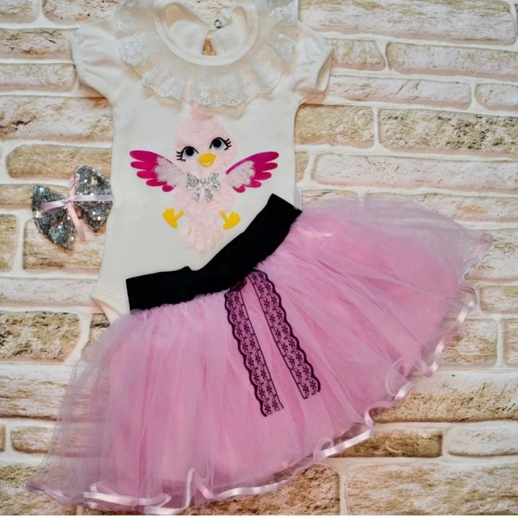 9-12-18 Ay Toka Hediyeli Kuş Desenli Tişört Tütü Etek 2li Kız Bebek Takımı Lila