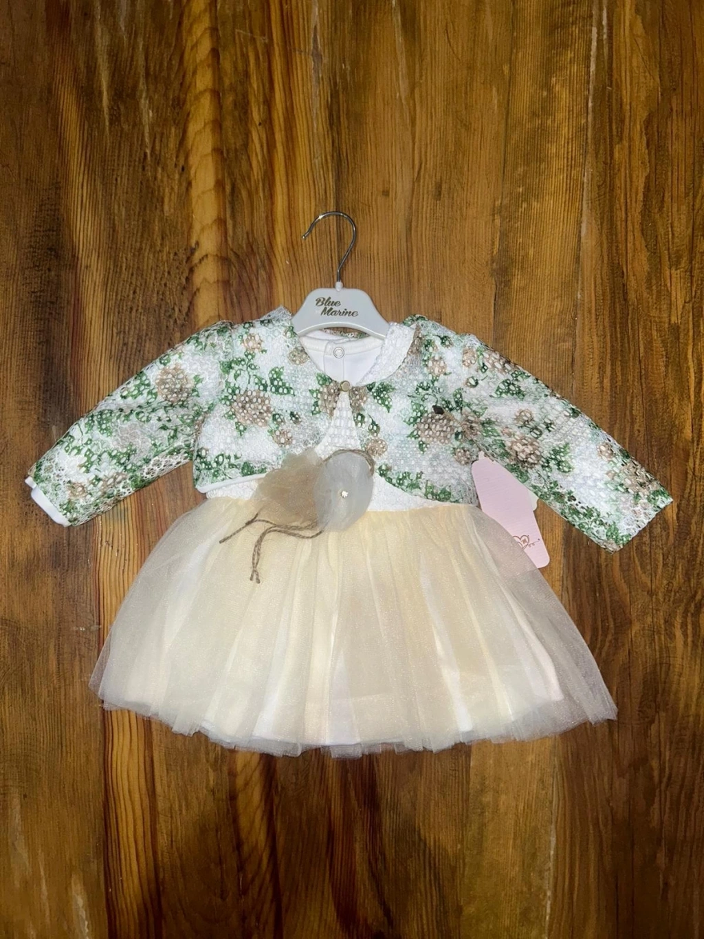Önü püsküllü boncuk detaylı kız çocuk elbisesi hardal