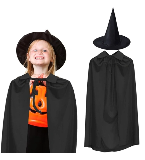 90 cm Siyah Yakalı Pelerin ve Siyah Cadı Şapkası Kostüm Seti