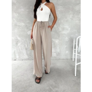 Kadın Yüksel Bel Beli Bağcıklı Rahat Boru Paça Pantalon - Kırık Beyaz