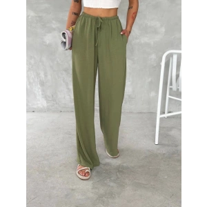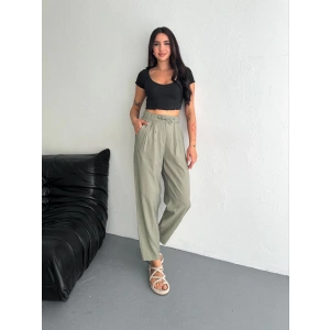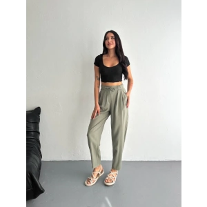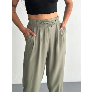 Kadın Yüksel Bel Beli Bağcıklı Cepli Rahat Paça Pantalon - Su Yeşili