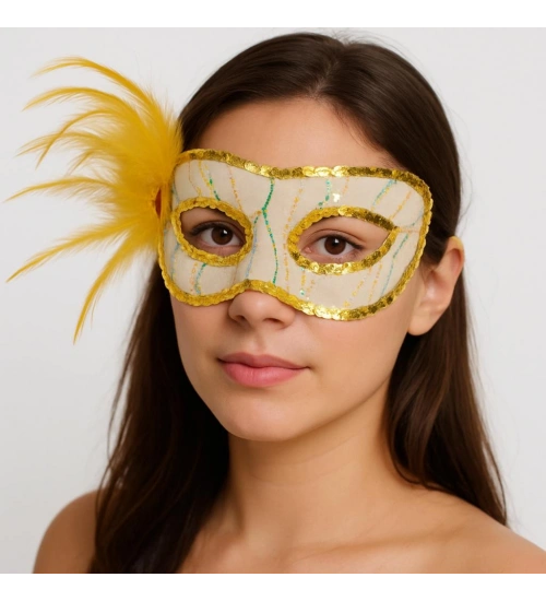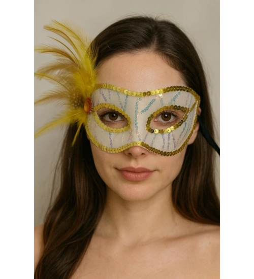 Altın Renk Yandan Tüylü Pul Payet İşlemeli Parti Maskesi 23x12 cm