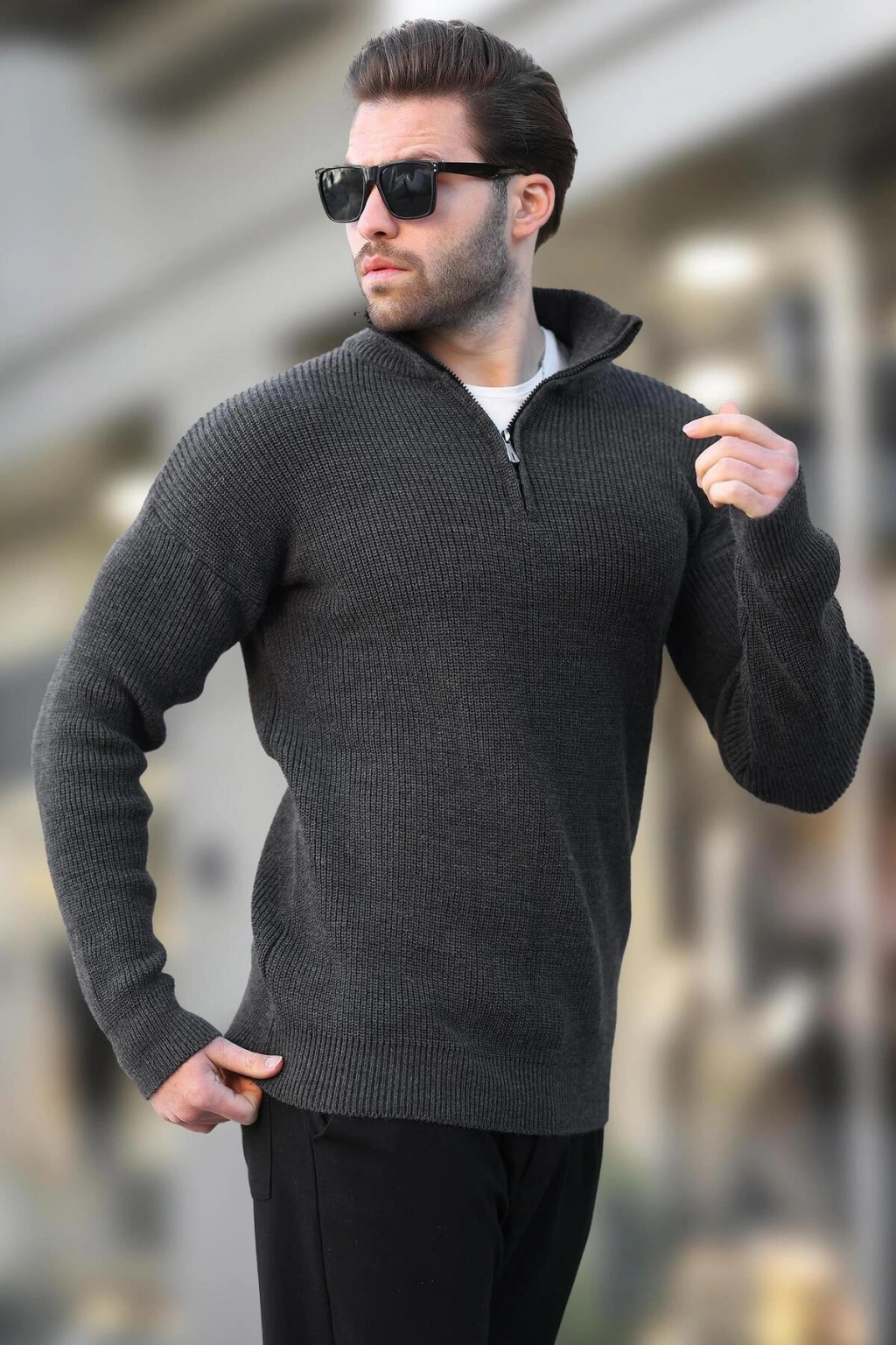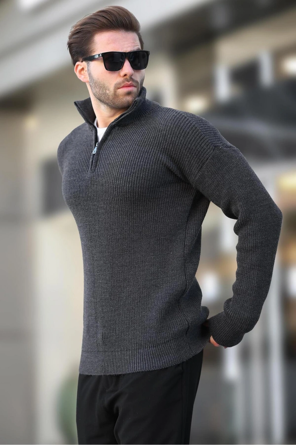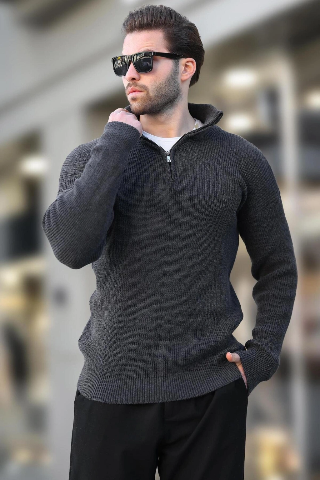 Erkek Polo Yaka Yarım Fermuarlı Regular Fit Kalıp Basic Düz Triko Kazak