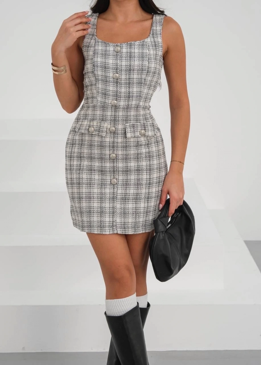 Askılı ch kumaş düğmeli elbise siyahbeyaz h265007