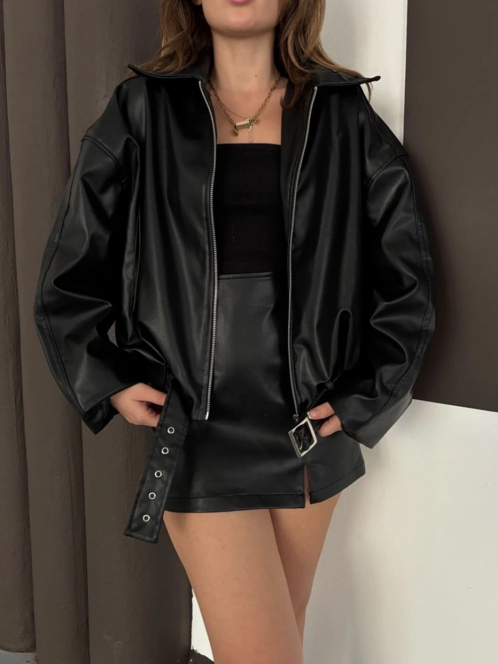 Crop bomber deri ceket siyah st2551985