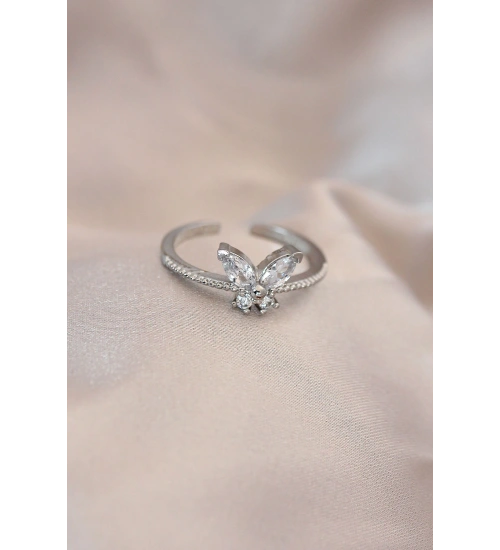 Ayarlamalı Gümüş Renk Metal Zirkon Taş ve Kristal Taşlı Kelebek Model Yüzük
