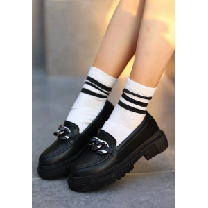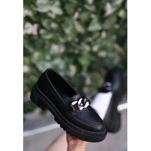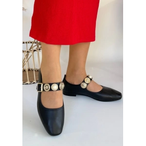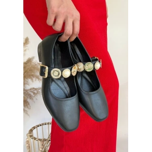Hante Siyah Beyaz Keten Taşlı Babet Ayakkabı