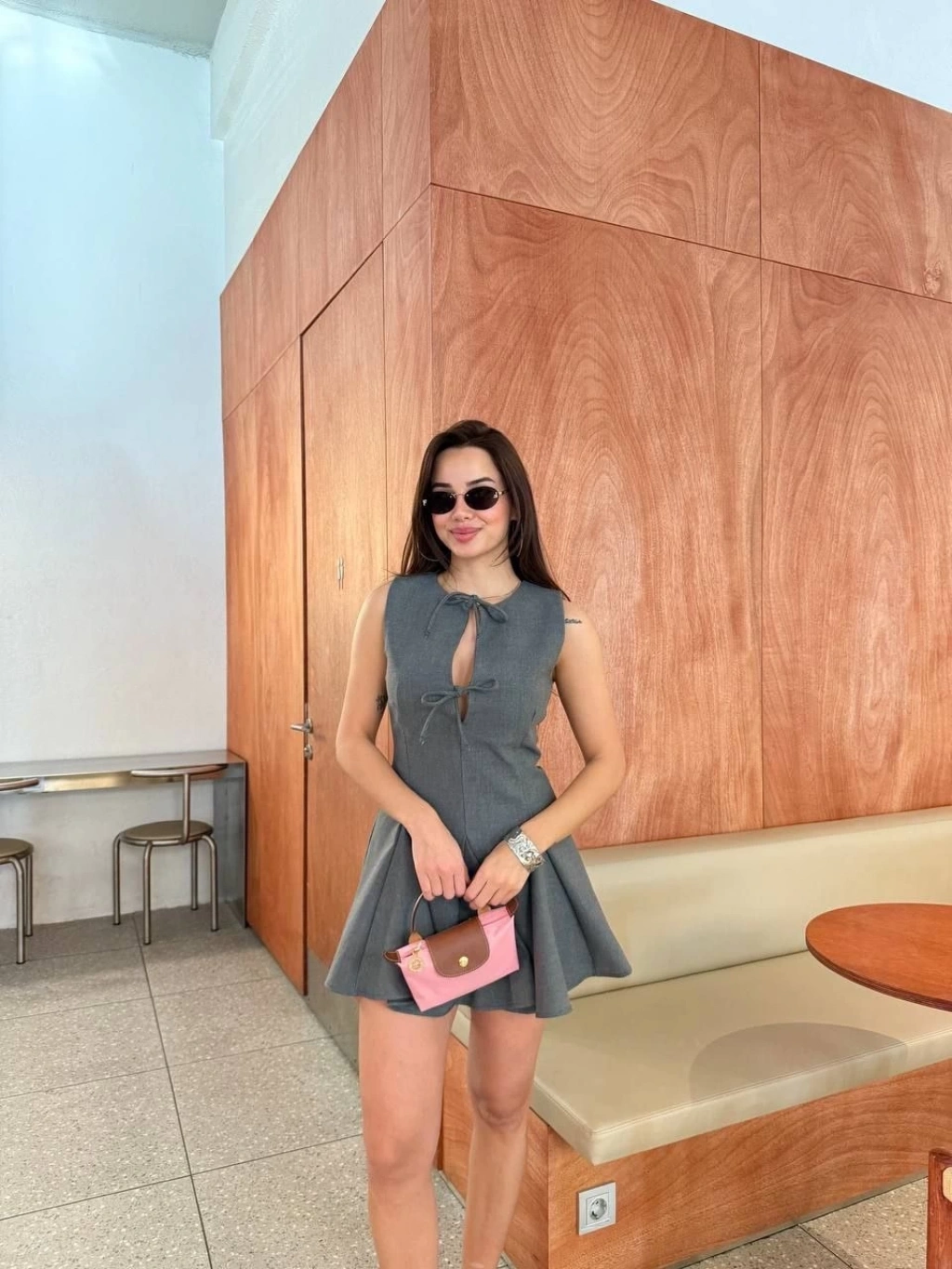 Kadın Göğsü Bağlamalı Kalp Yaka Kolları Şifon Mini Elbise - Siyah Pembe