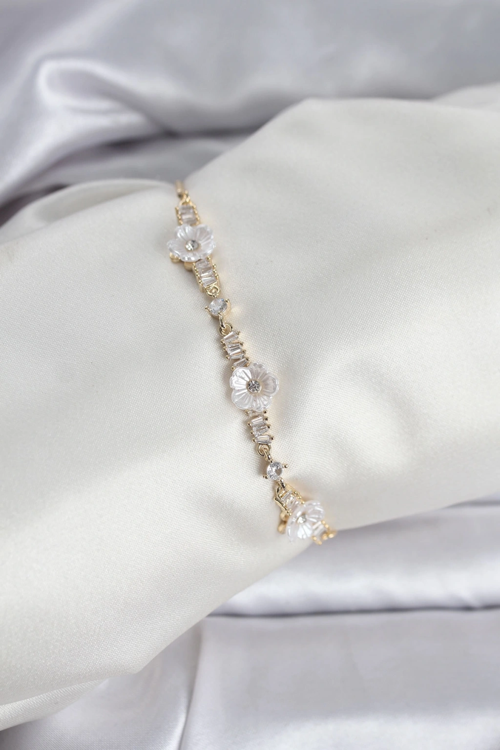 Baget Zirkon Taşlı Çiçek Model Gold Renk Asansörlü Kadın Bileklik