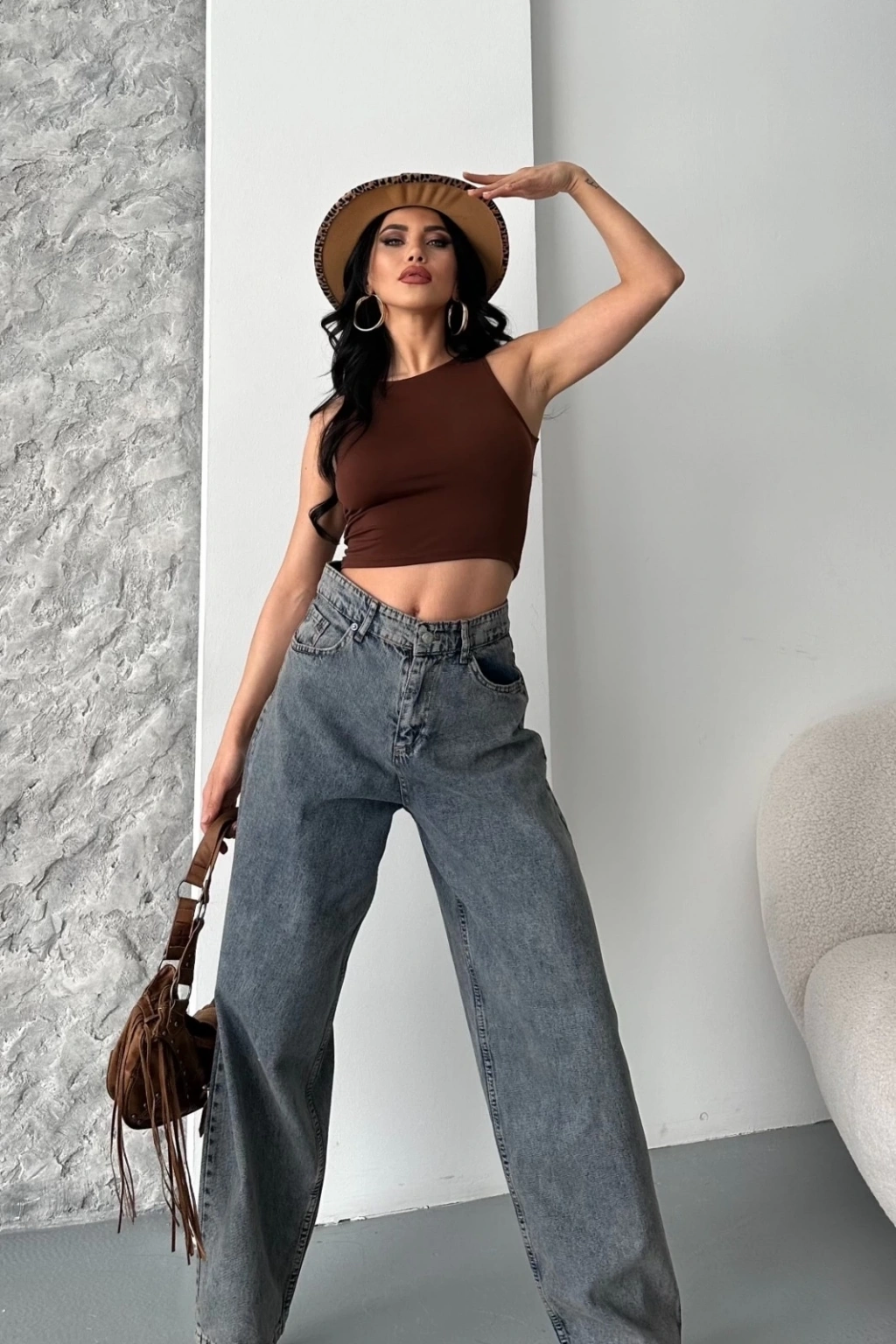 Baggy kar yıkama eskitme kahve jeans pantolon d2007 ile tarzınızı tamamlayarak şıklığı yakalayabilirsiniz.