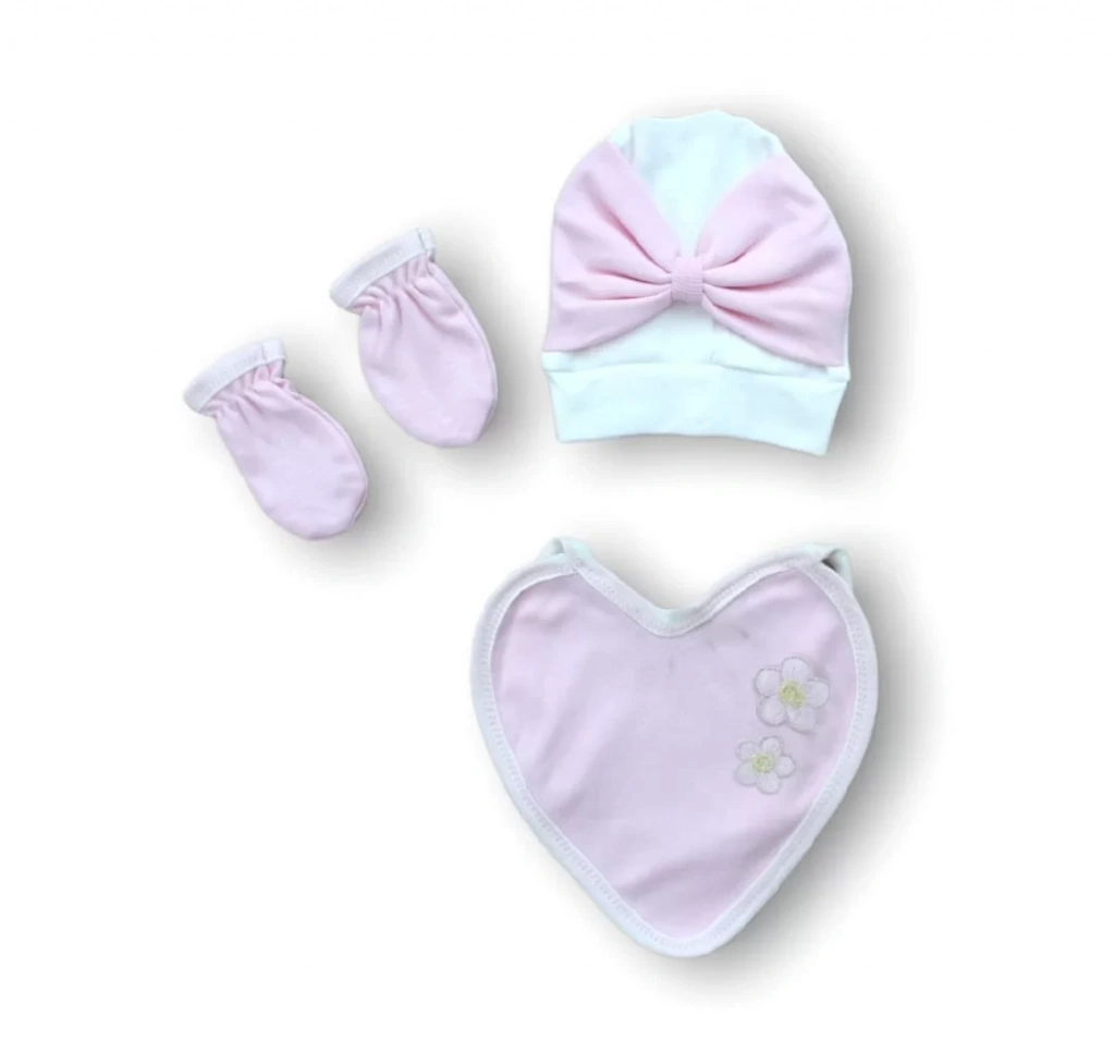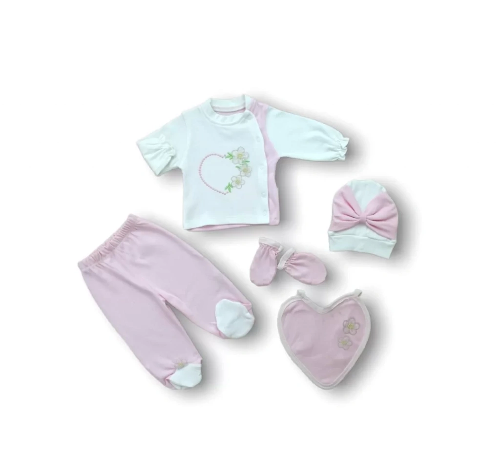 Baharın Çiçekli Kalbi Nakışlı 5li Zıbın Takımı Hastane Çıkışı Pembe