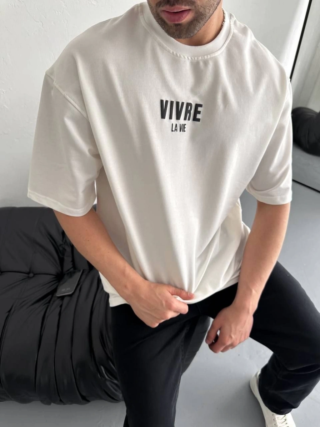 Erkek Asit Yıkama Bisiklet Yaka Kısa Kollu Oversize T-Shirt Tişört - Beyaz