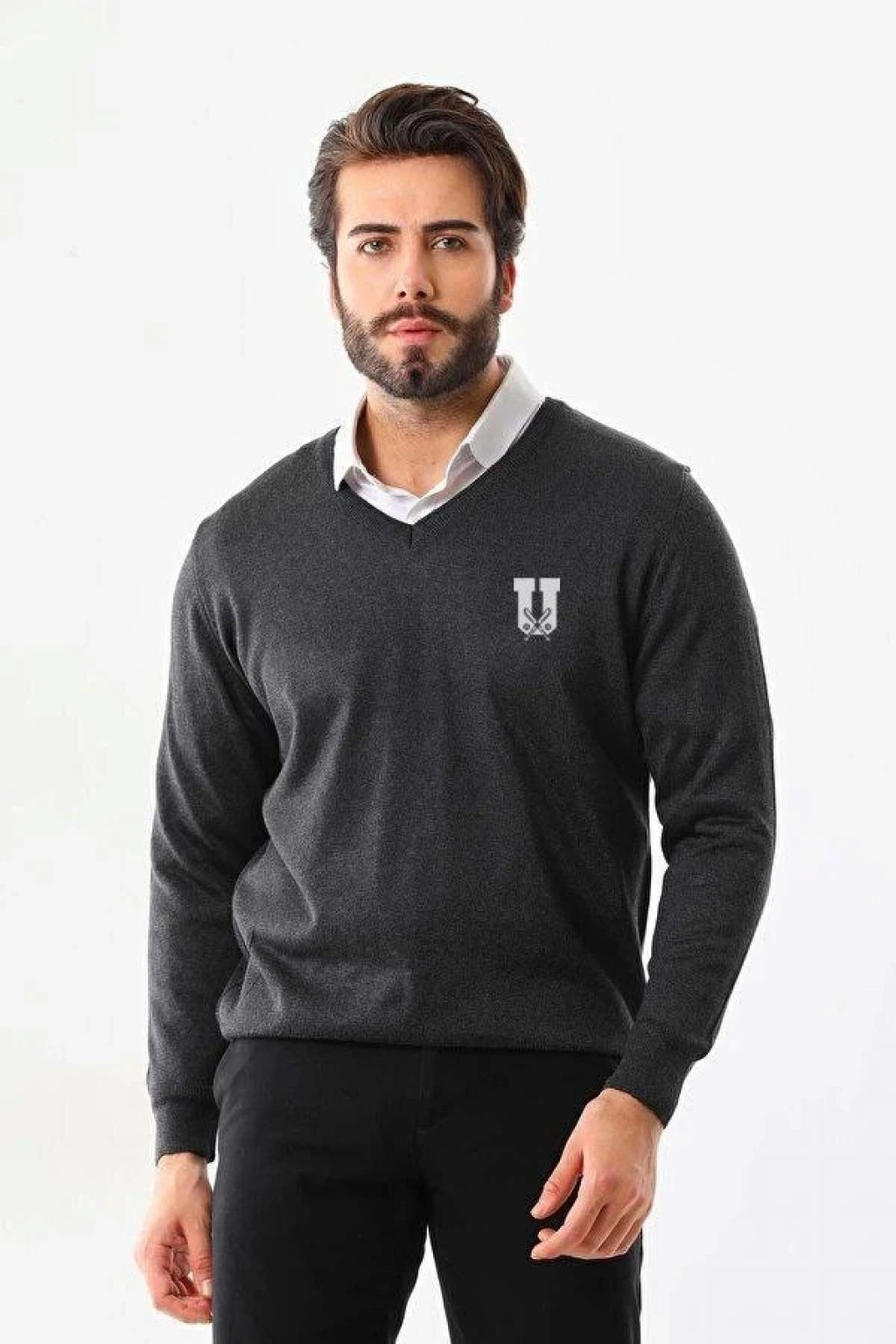 Baskılı V Yaka Uzun Kol Dokuma Triko - Füme
