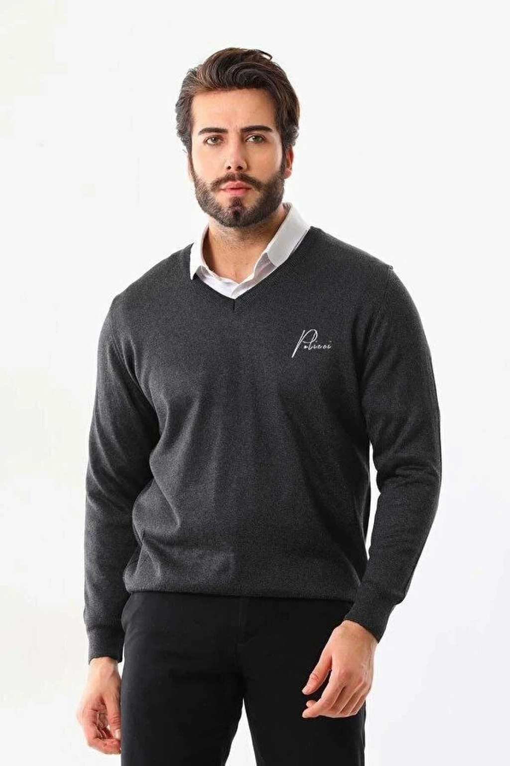 Baskılı V Yaka Uzun Kol Dokuma Triko - Füme