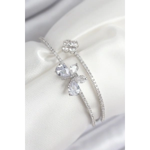 Pirinç Zirkon Taşlı Kelebek Ve Yonca Model Gümüş Renk Kadın Bileklik